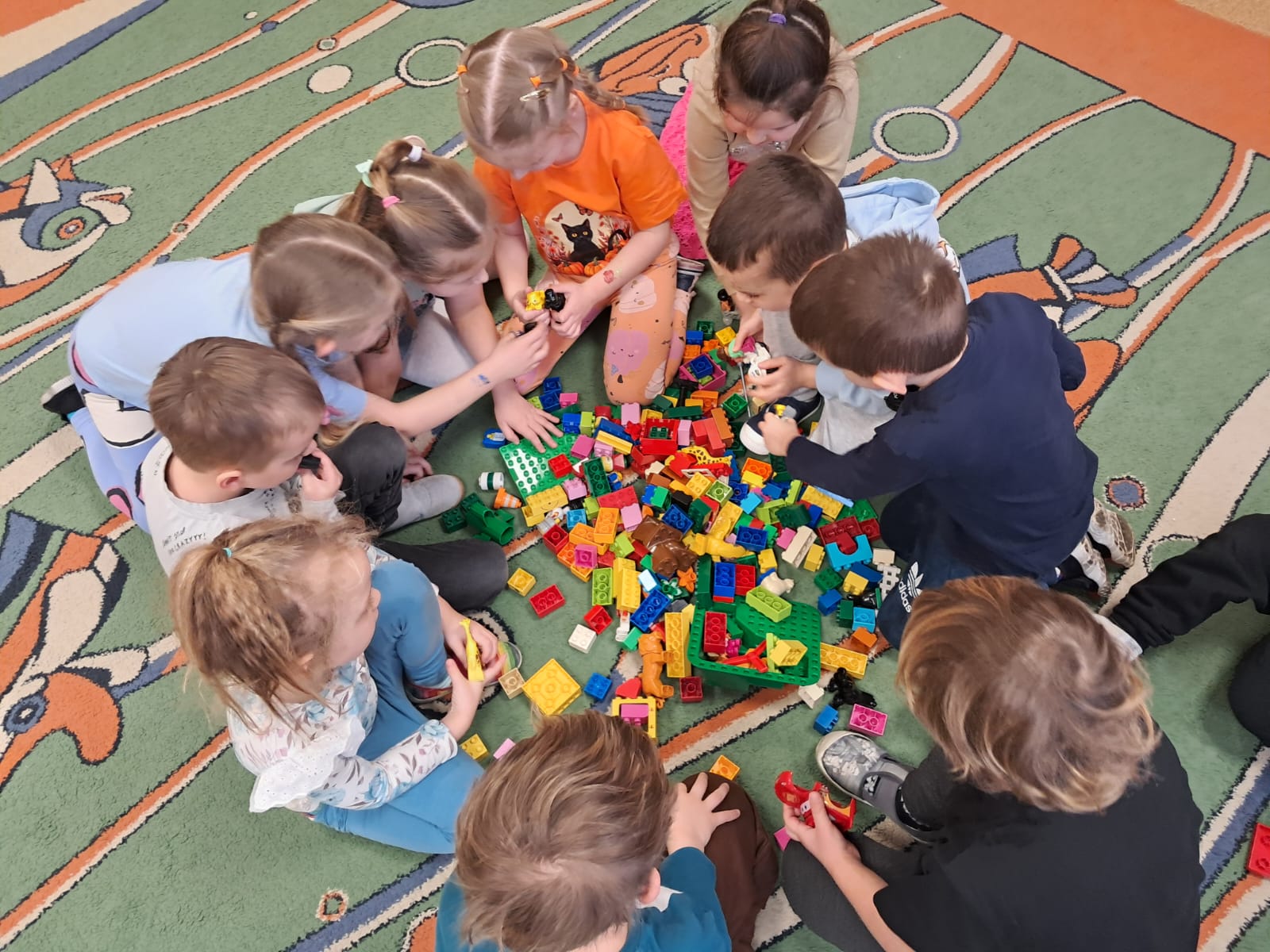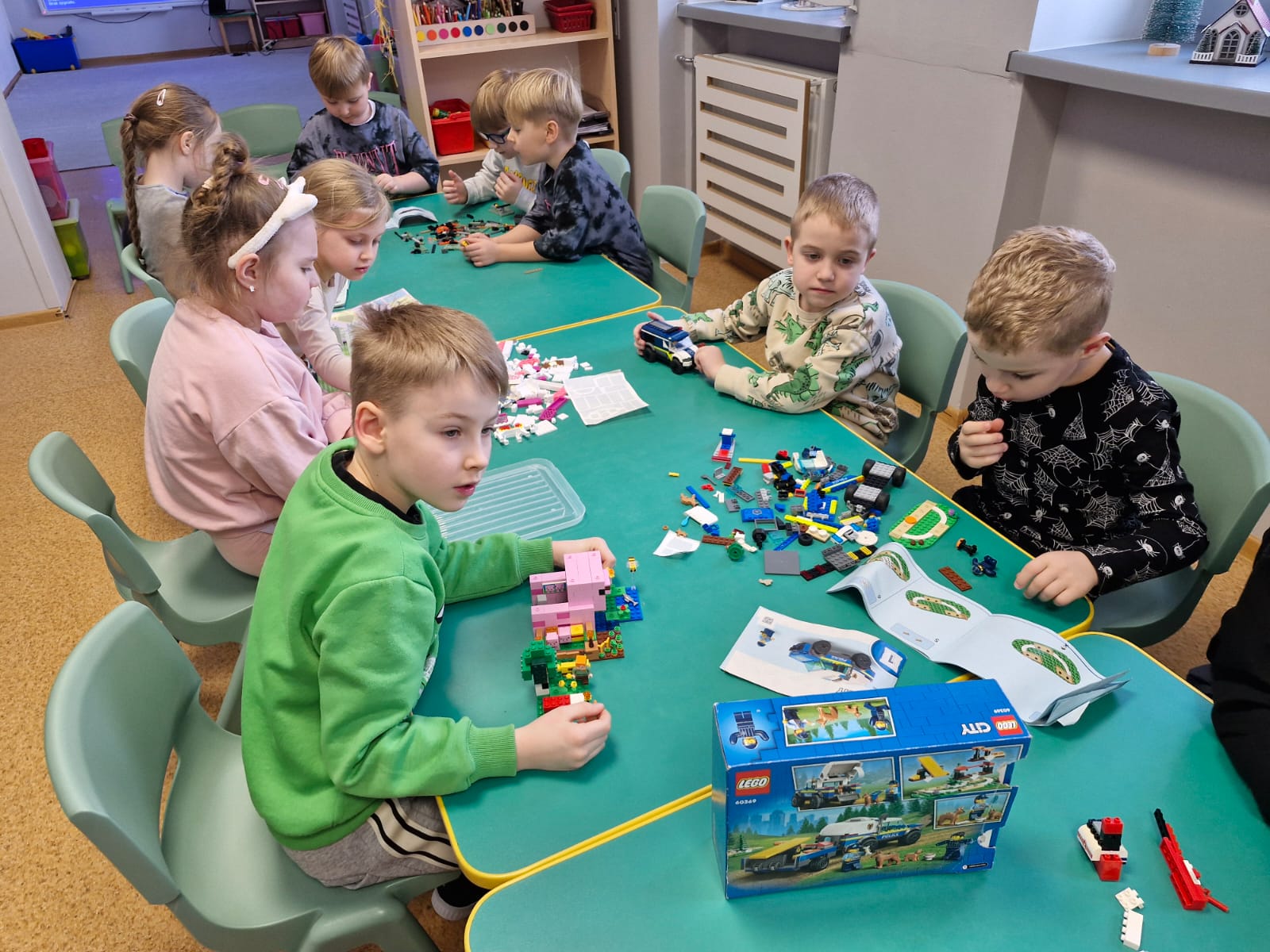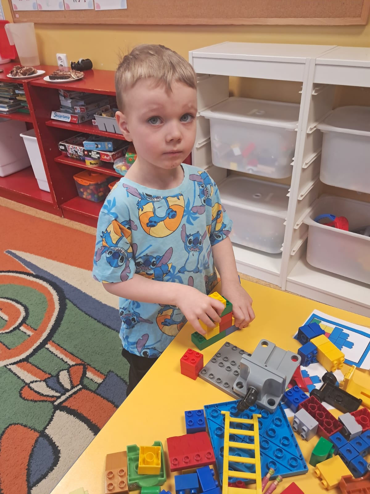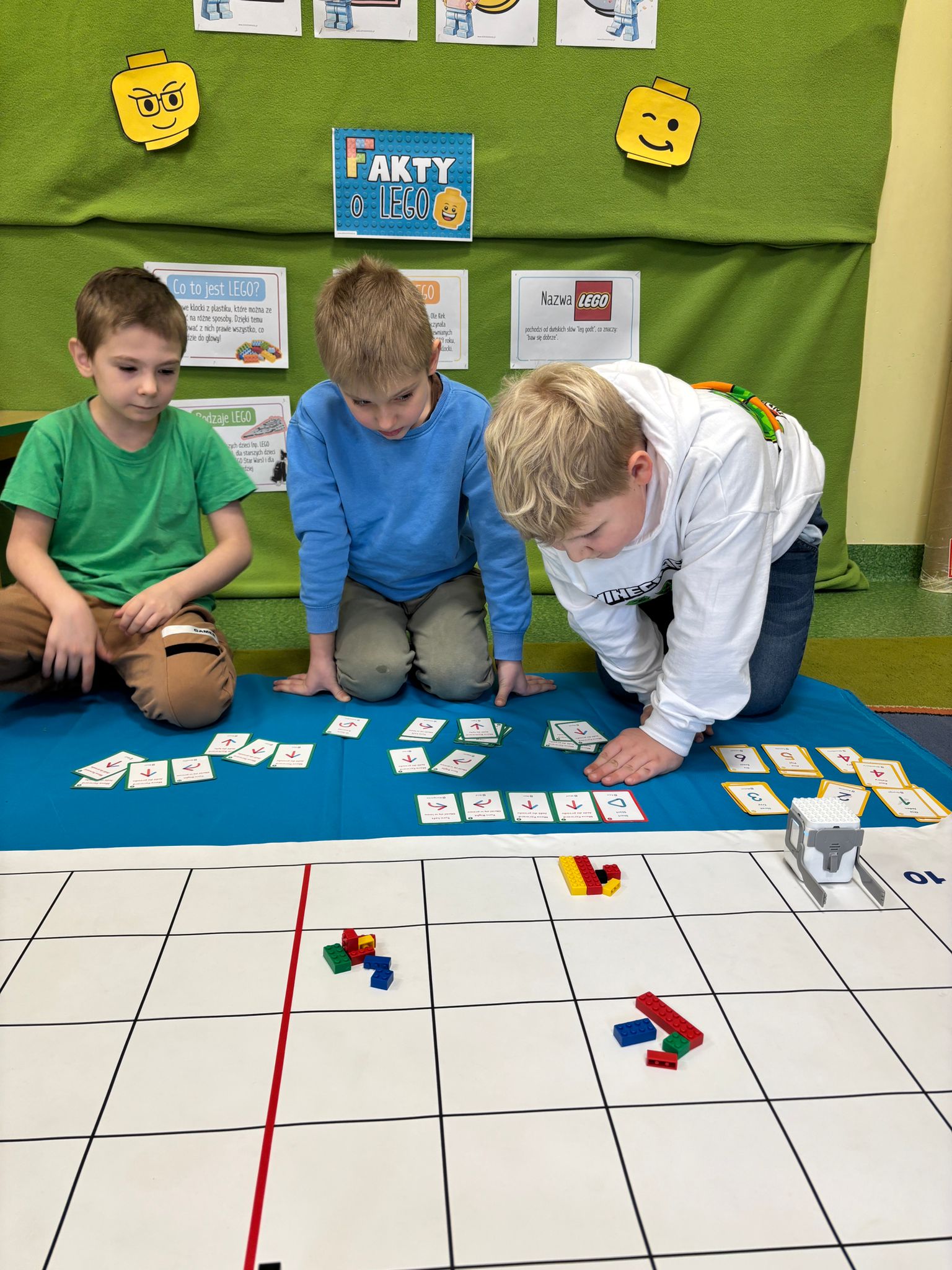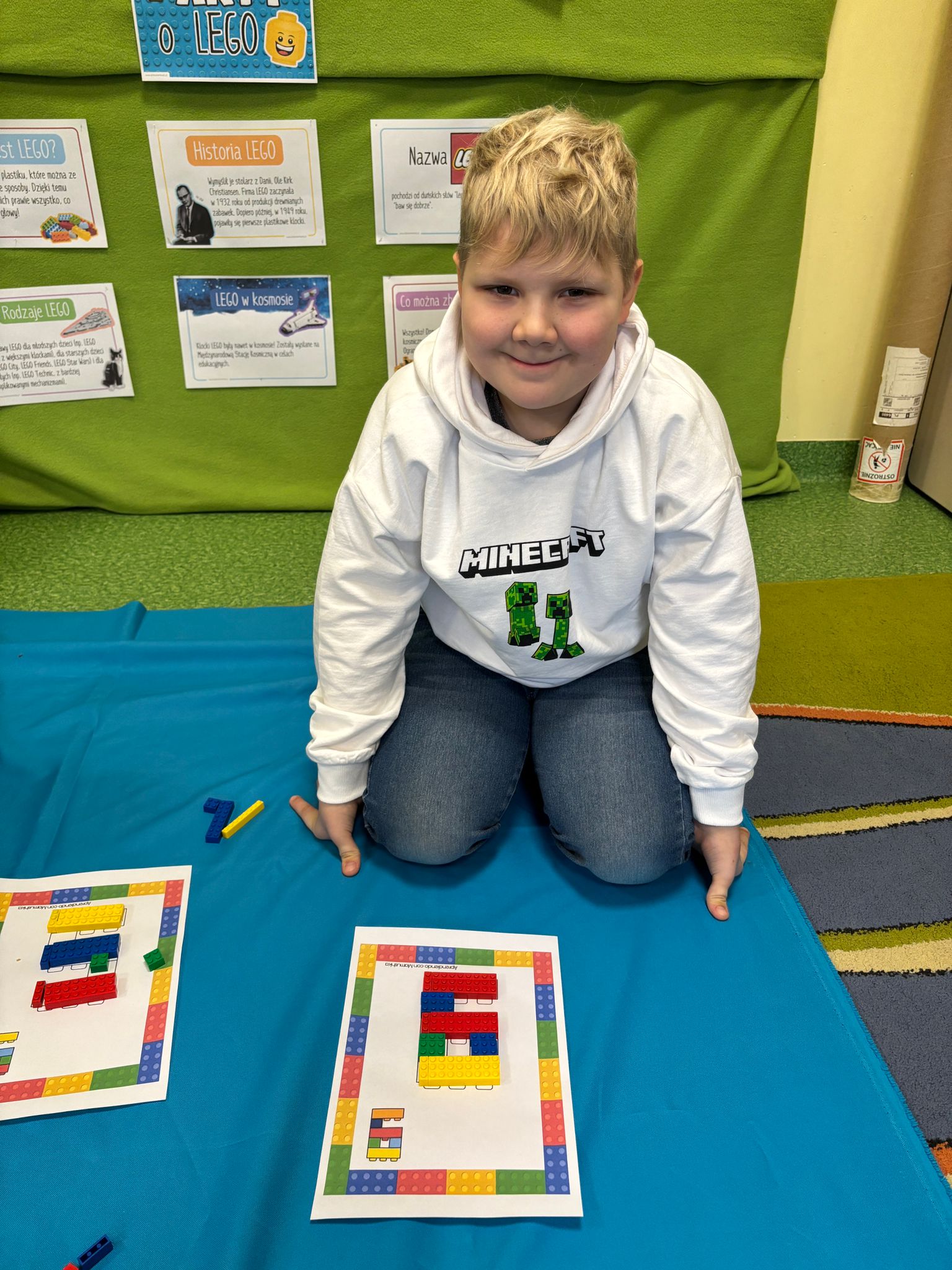 Z tej okazji nasze przedszkolaki wzięły udział w zajęciach dydaktycznych poświęconych właśnie klockom LEGO. Nie służyły one wyłącznie do konstruowania i budowania wspaniałych budowli. Były także wykorzystywane podczas zadań matematycznych, takich jak kodowanie z użyciem GeniBota, utrwalanie znajomości poznanych cyfr, układanie wyrazów z rozsypanych sylab oraz tworzenie prac plastycznych.