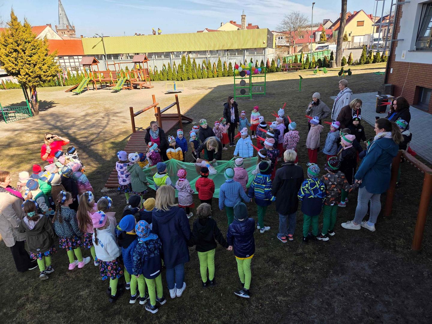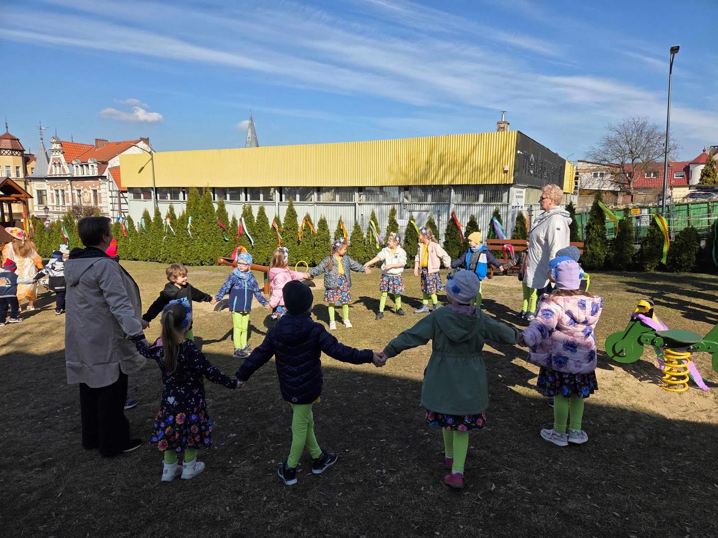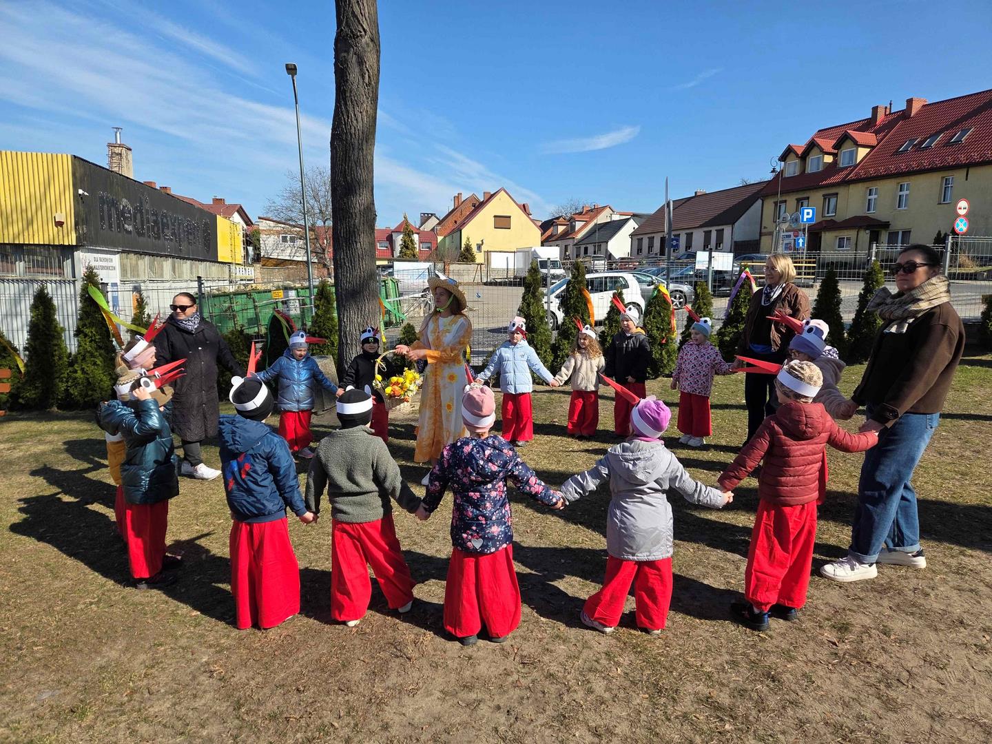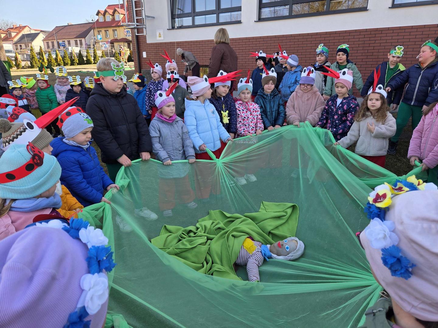 20 marca dzieci z naszego przedszkola, wraz z Panią Dyrektor Katarzyną Just, wyruszyły ulicami miasta, by radośnie powitać Panią Wiosnę. Ich kolorowe stroje oraz dźwięki instrumentów muzycznych ożywiły miasto, a szczególnie Plac Wolności w Czarnkowie, gdzie do wspólnego świętowania dołączył Burmistrz Miasta Czarnków Pan Jacek Klimaszewski. Podczas uroczystości symboliczna Pani Zima została przekazana na jego ręce, co oznacza, że od dziś w mieście oficjalnie zagościła wiosna.