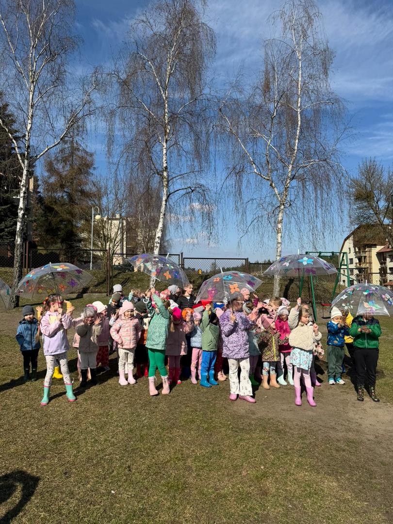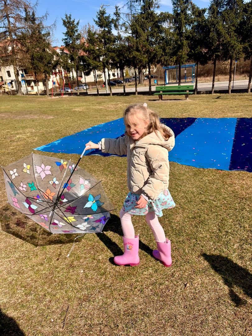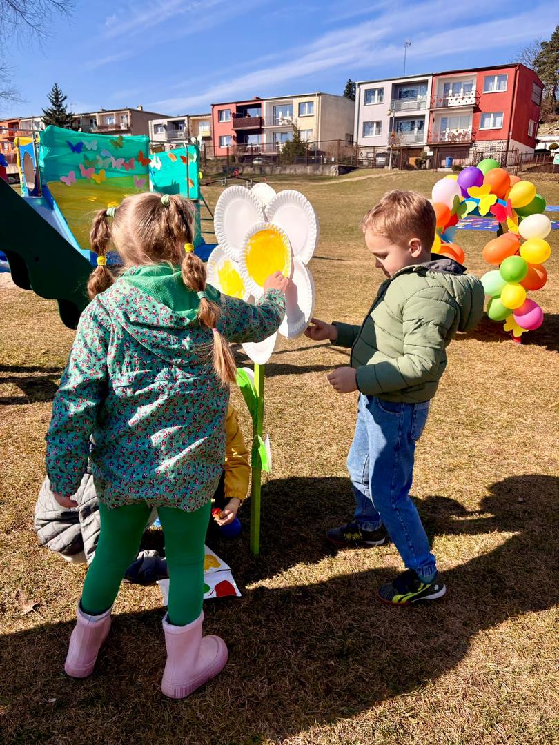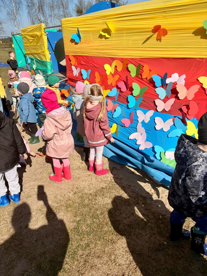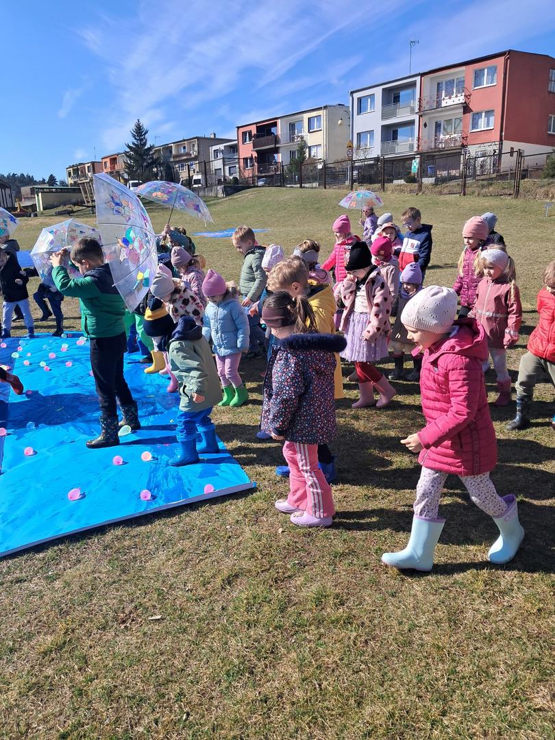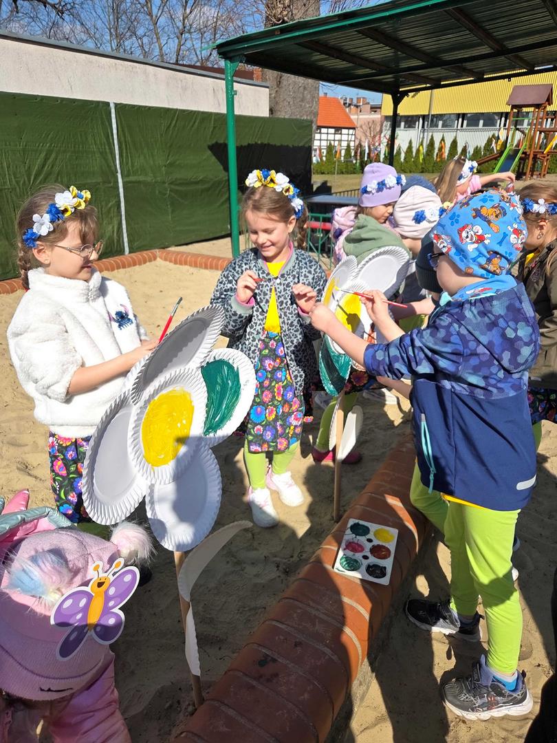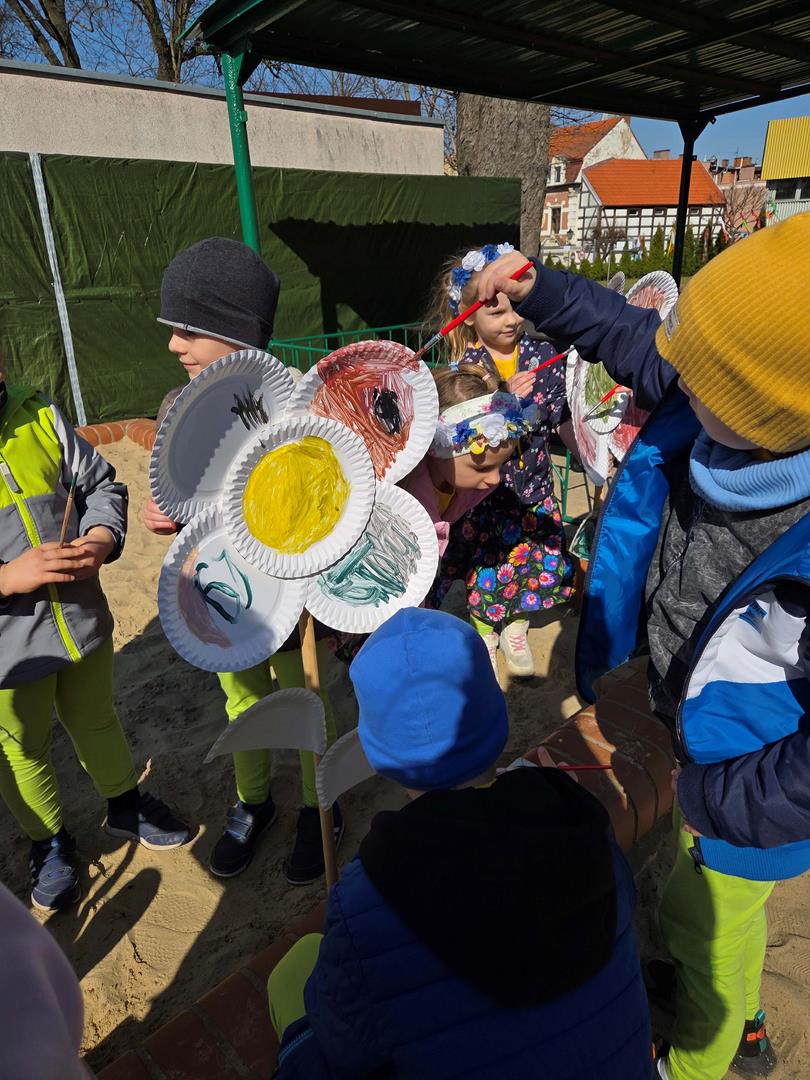 Równie ciekawie było w przedszkolu przy ul. Rolnej, gdzie dzieci wyruszyły w niezwykłą podróż w poszukiwaniu wiosny. Podczas tej wyprawy wykonywały różnorodne zadania – ozdabiały statek kolorowymi motylami, zbierały ryby i tworzyły z nich „ławice”, a następnie podróżowały statkiem do krainy Wiosny. Na ich drodze pojawiła się również kolorowa brama, przez którą musiały przejść, by dotrzeć na kwiecistą łąkę. Nie zabrakło także działań plastycznych – dzieci malowały kwiaty farbami, a wiosenny pochód z parasolkami oraz zabawa sensoryczna „wiosenny deszczyk” dostarczały im wielu radosnych wrażeń.