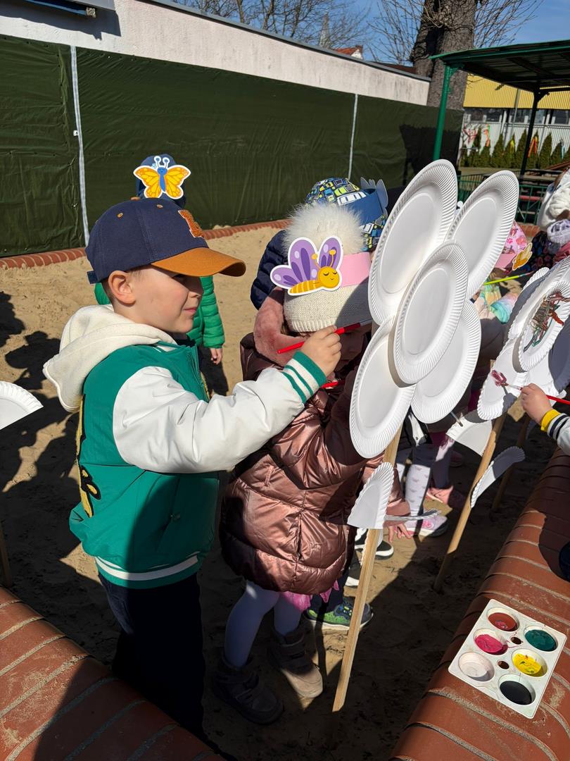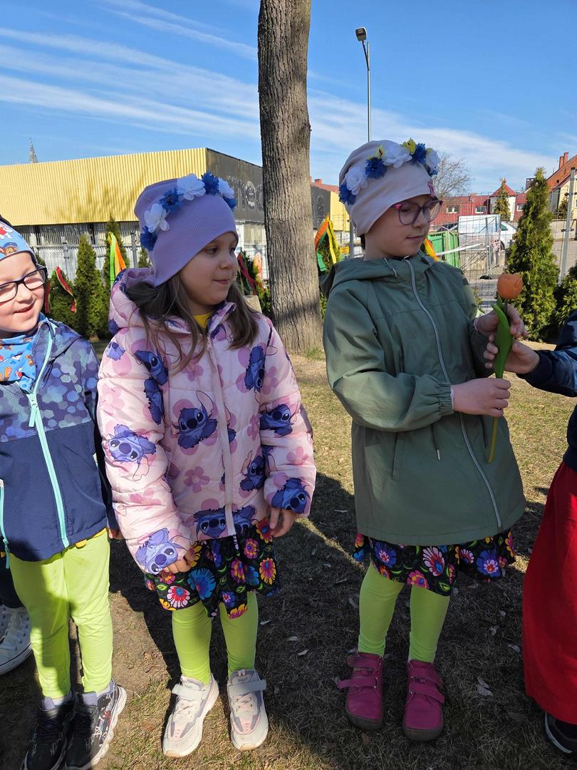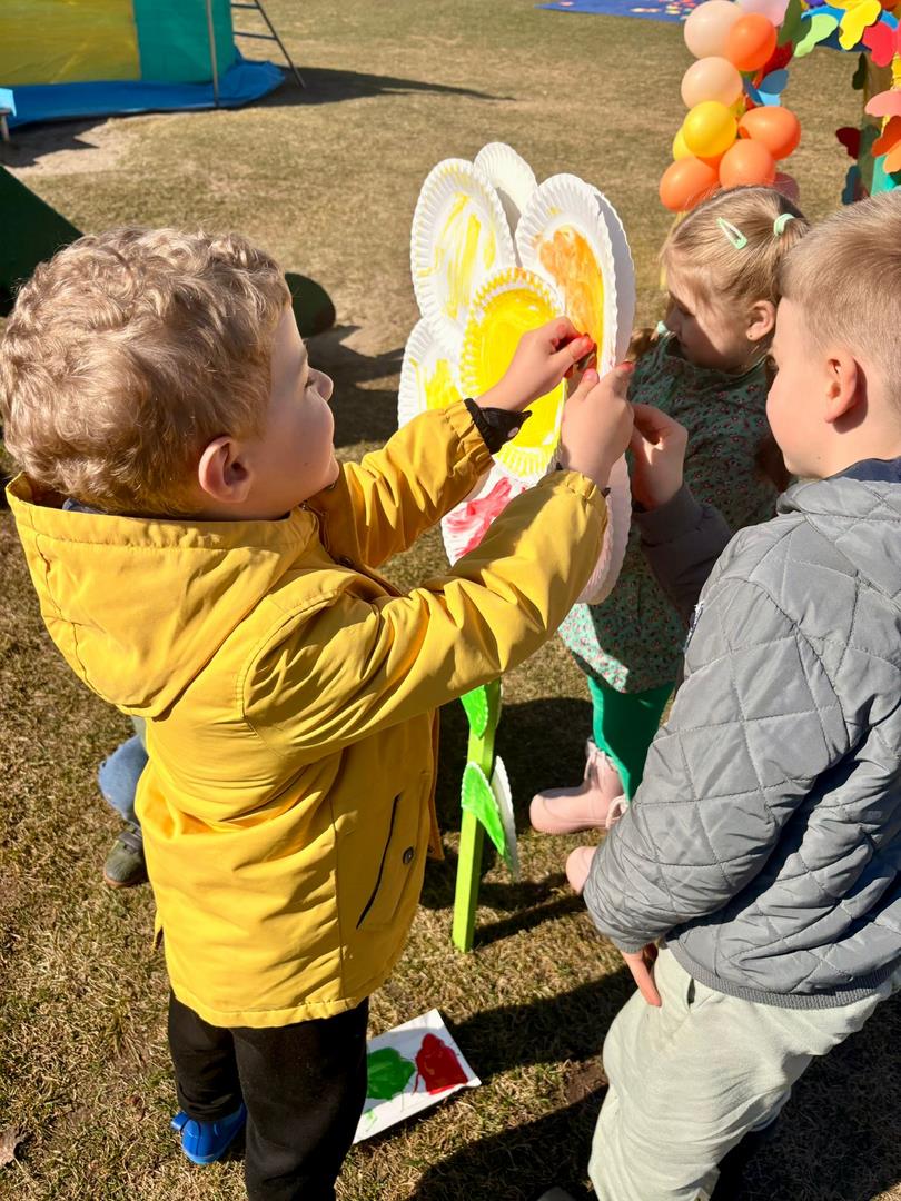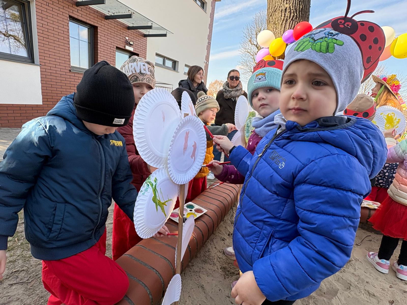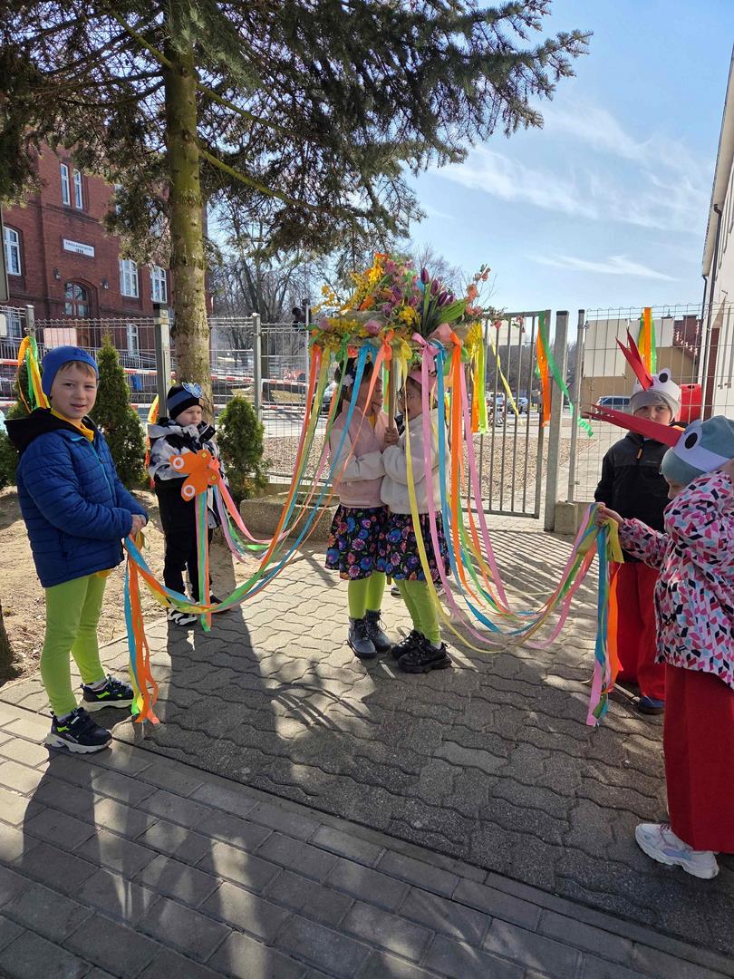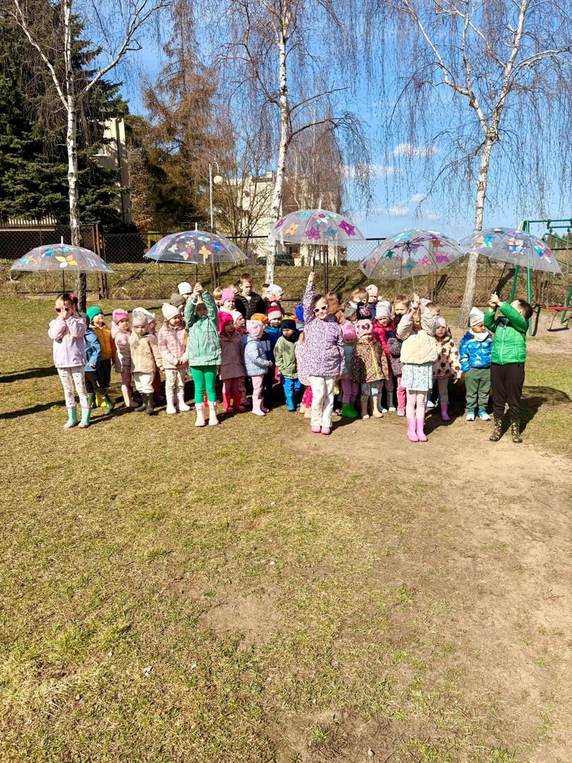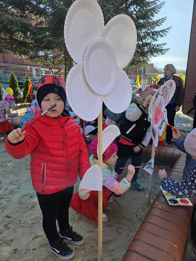 Równie ciekawie było w przedszkolu przy ul. Rolnej, gdzie dzieci wyruszyły w niezwykłą podróż w poszukiwaniu wiosny. Podczas tej wyprawy wykonywały różnorodne zadania – ozdabiały statek kolorowymi motylami, zbierały ryby i tworzyły z nich „ławice”, a następnie podróżowały statkiem do krainy Wiosny. Na ich drodze pojawiła się również kolorowa brama, przez którą musiały przejść, by dotrzeć na kwiecistą łąkę. Nie zabrakło także działań plastycznych – dzieci malowały kwiaty farbami, a wiosenny pochód z parasolkami oraz zabawa sensoryczna „wiosenny deszczyk” dostarczały im wielu radosnych wrażeń.