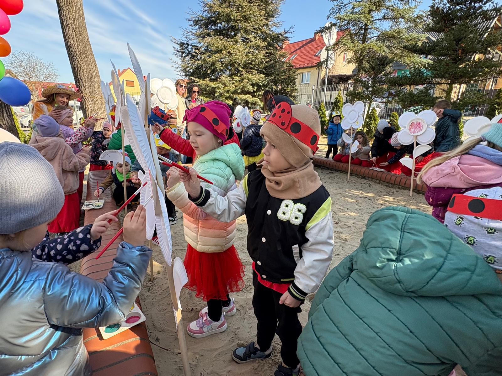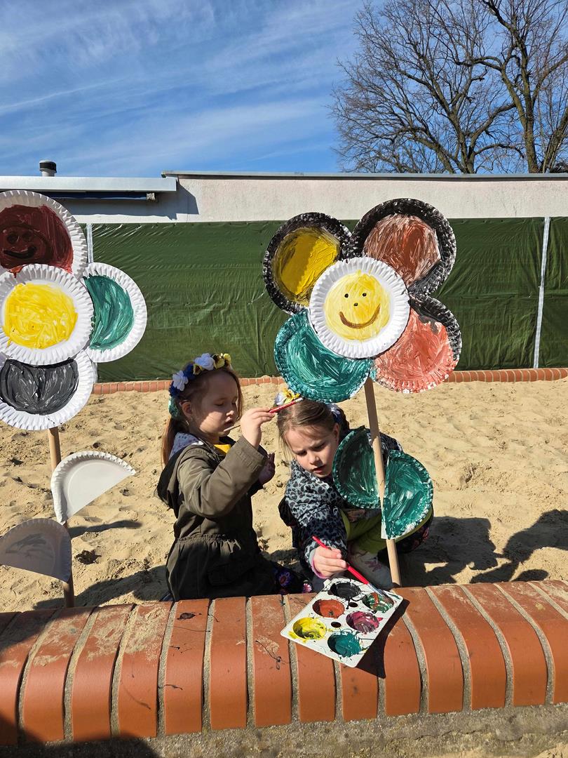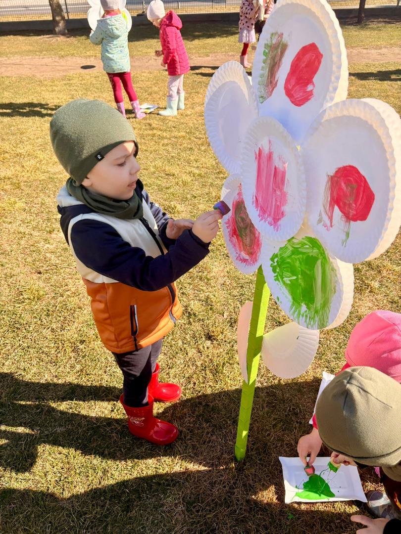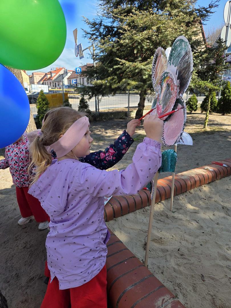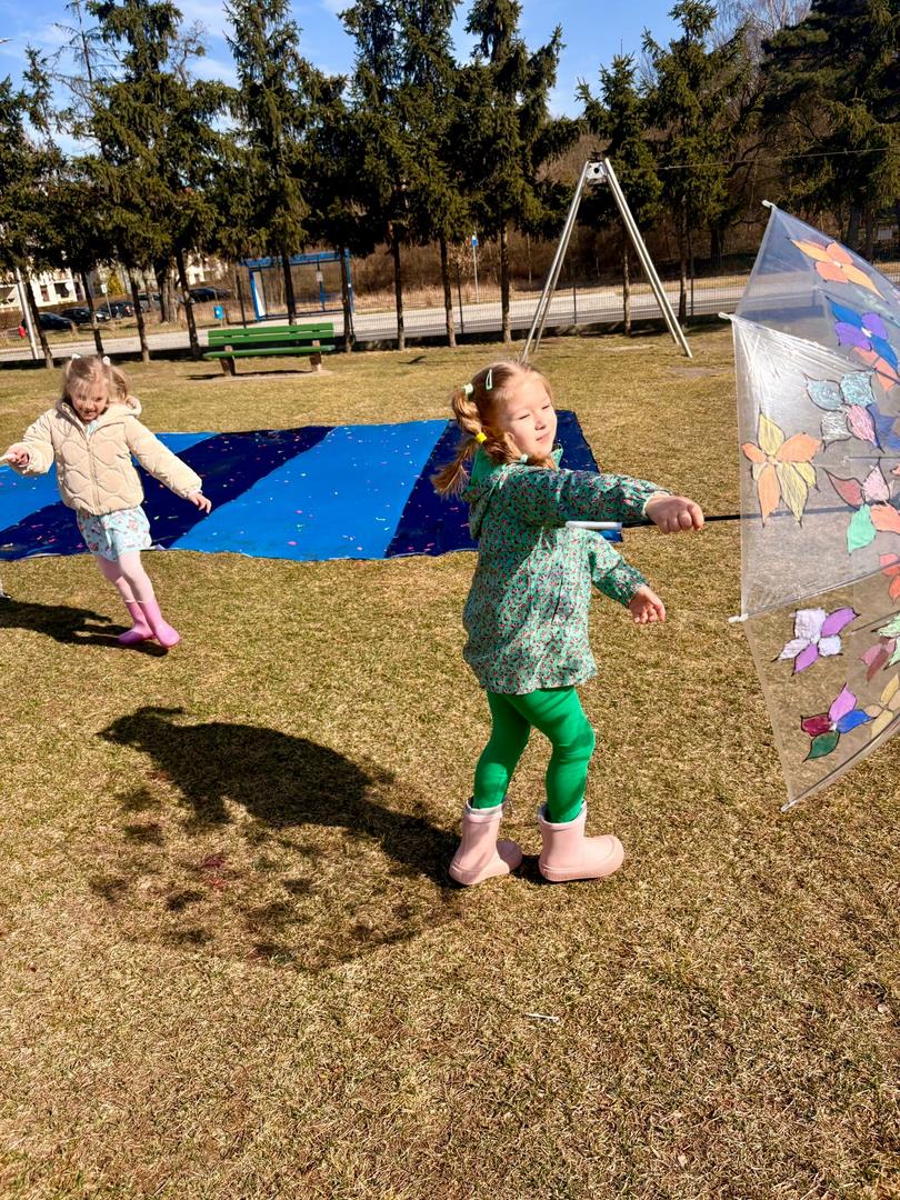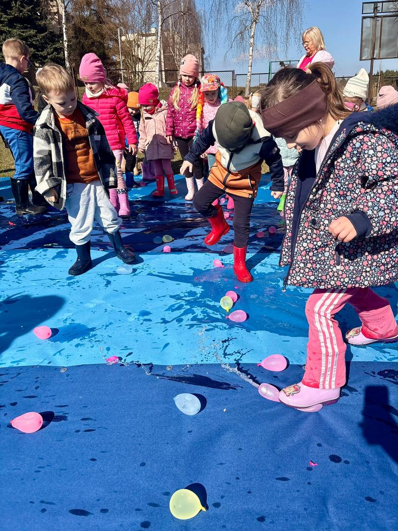 Równie ciekawie było w przedszkolu przy ul. Rolnej, gdzie dzieci wyruszyły w niezwykłą podróż w poszukiwaniu wiosny. Podczas tej wyprawy wykonywały różnorodne zadania – ozdabiały statek kolorowymi motylami, zbierały ryby i tworzyły z nich „ławice”, a następnie podróżowały statkiem do krainy Wiosny. Na ich drodze pojawiła się również kolorowa brama, przez którą musiały przejść, by dotrzeć na kwiecistą łąkę. Nie zabrakło także działań plastycznych – dzieci malowały kwiaty farbami, a wiosenny pochód z parasolkami oraz zabawa sensoryczna „wiosenny deszczyk” dostarczały im wielu radosnych wrażeń.