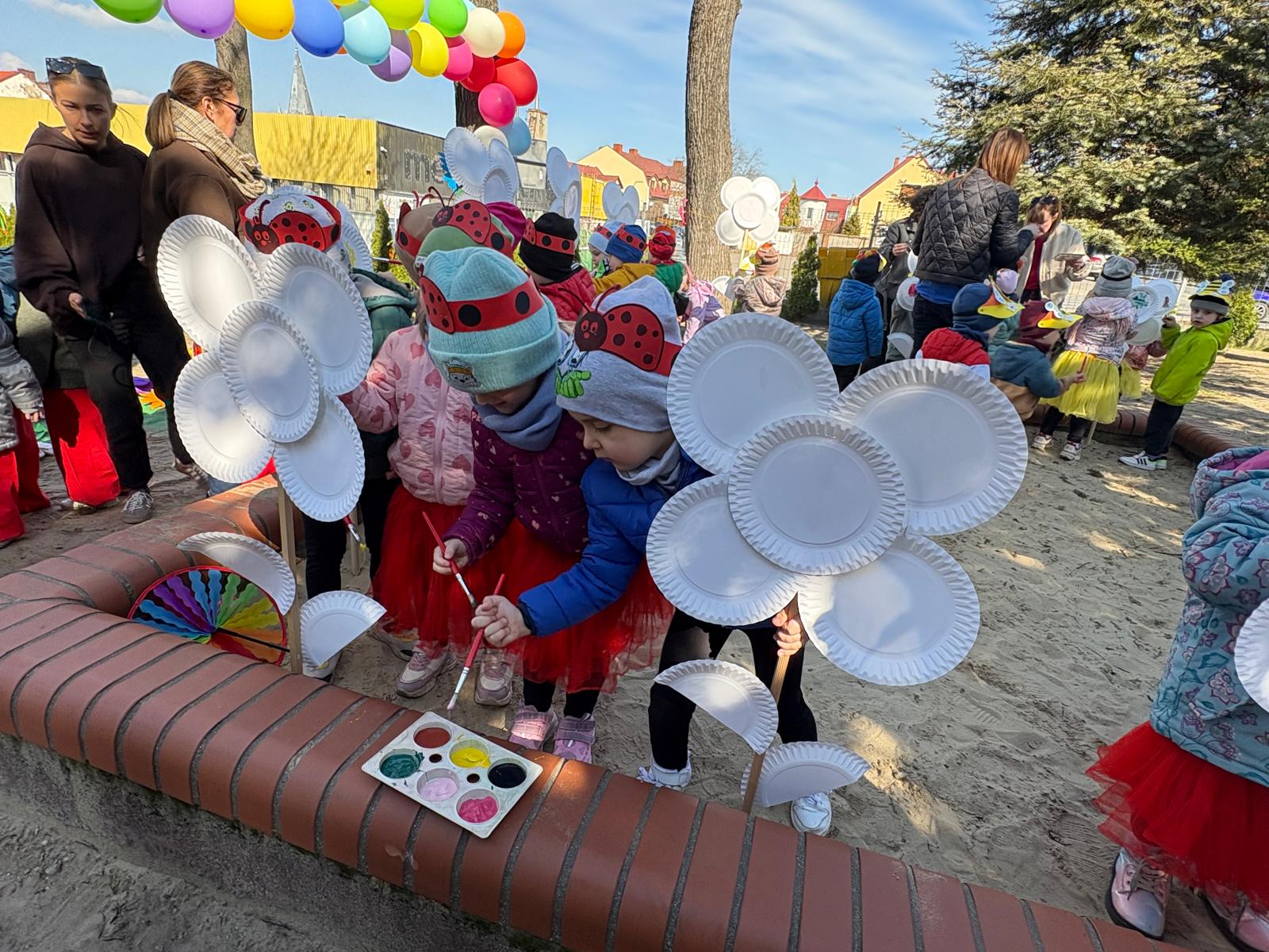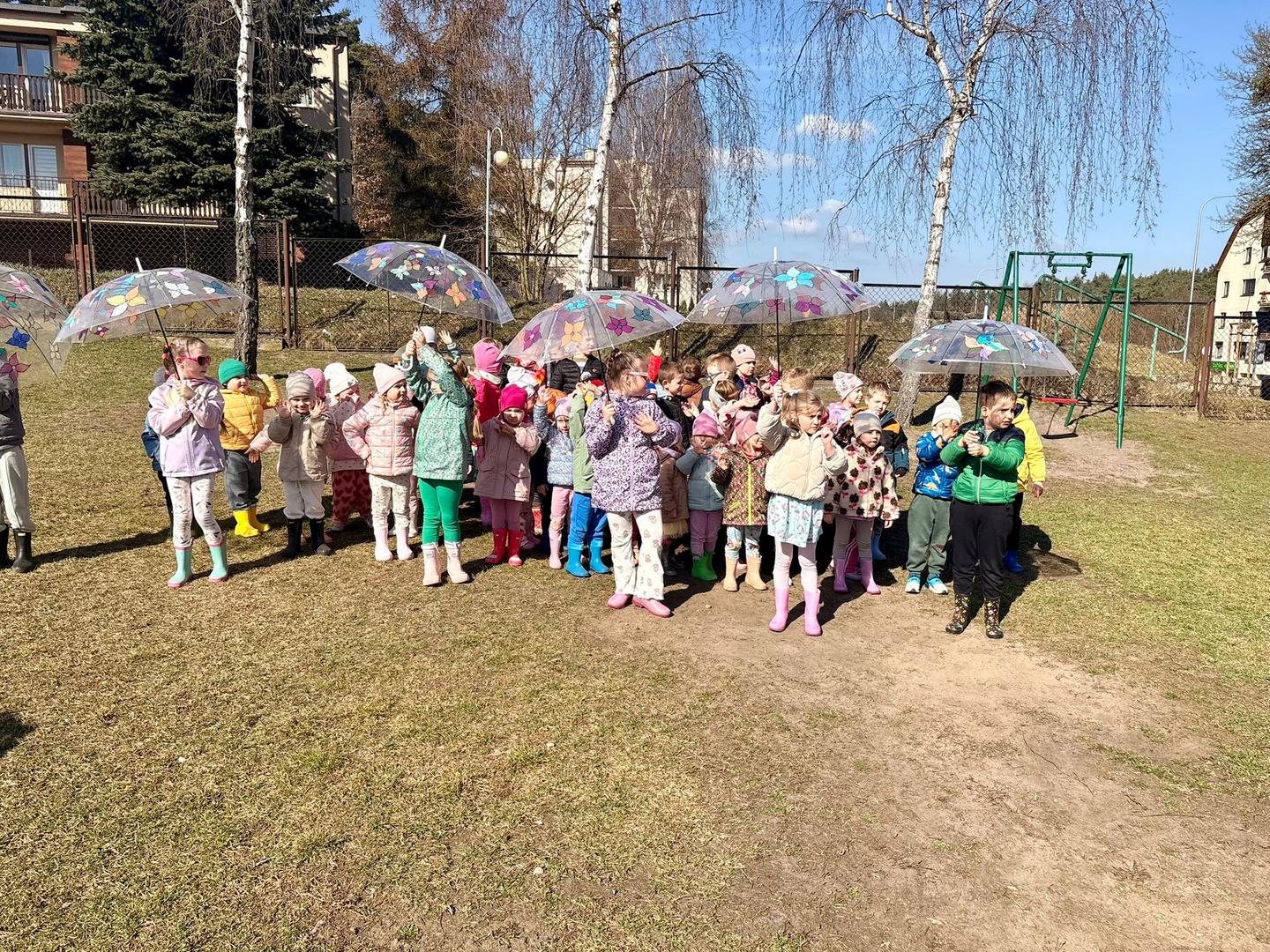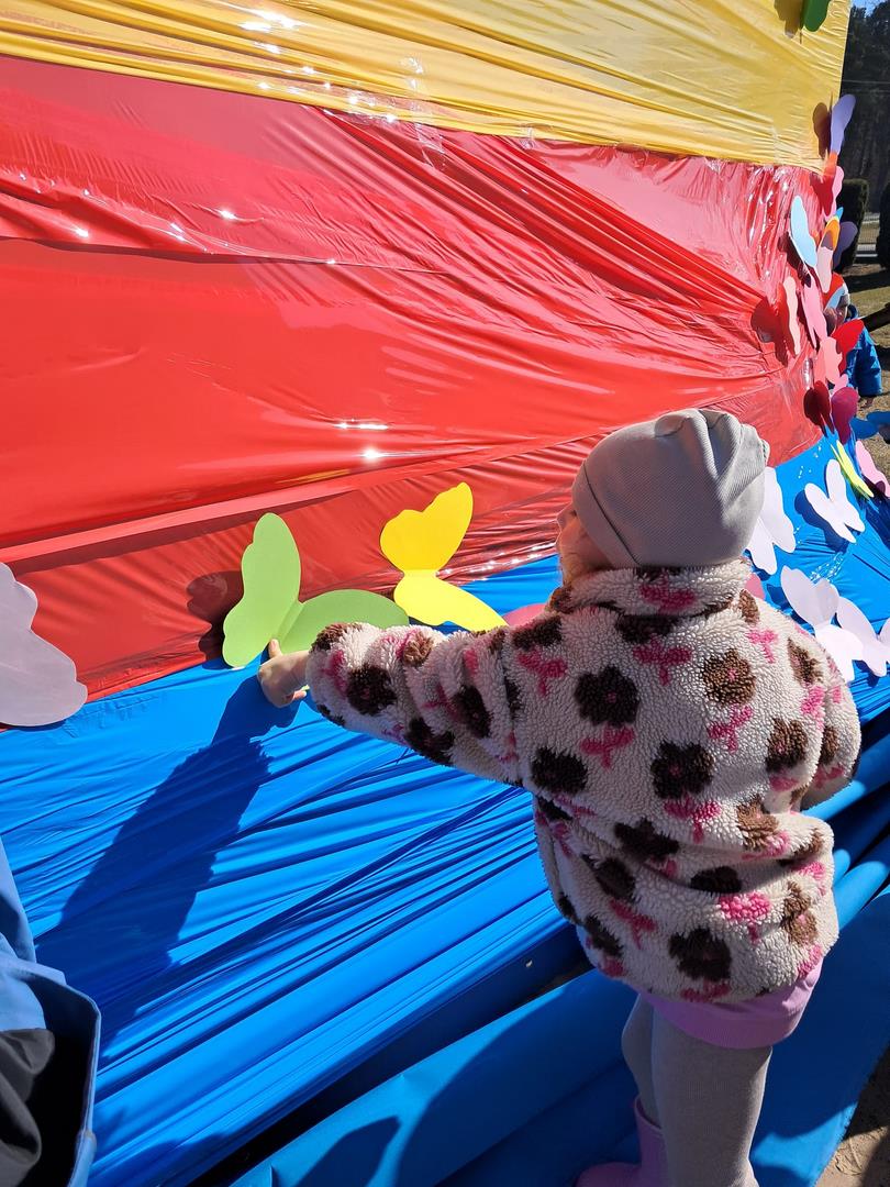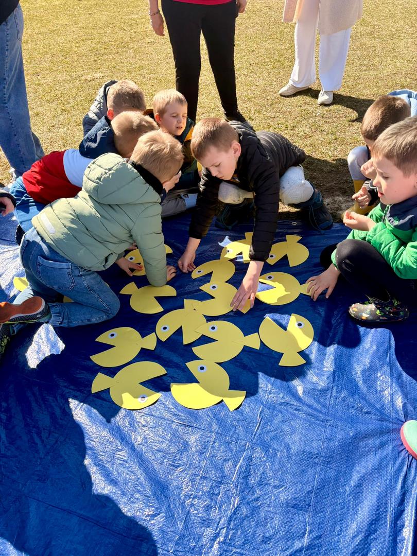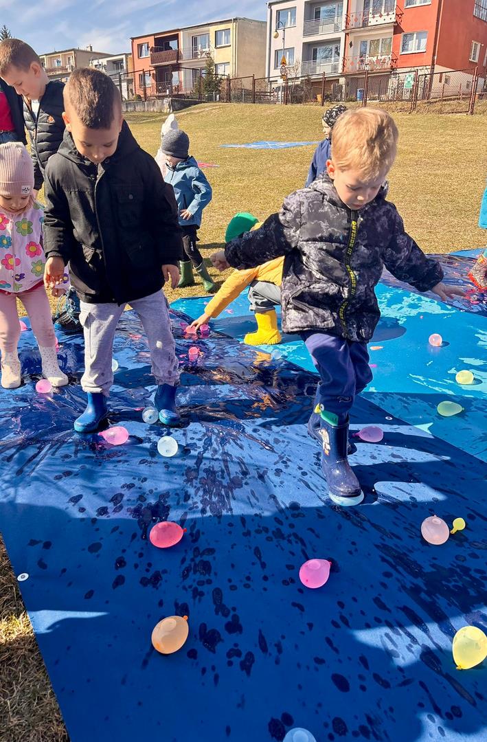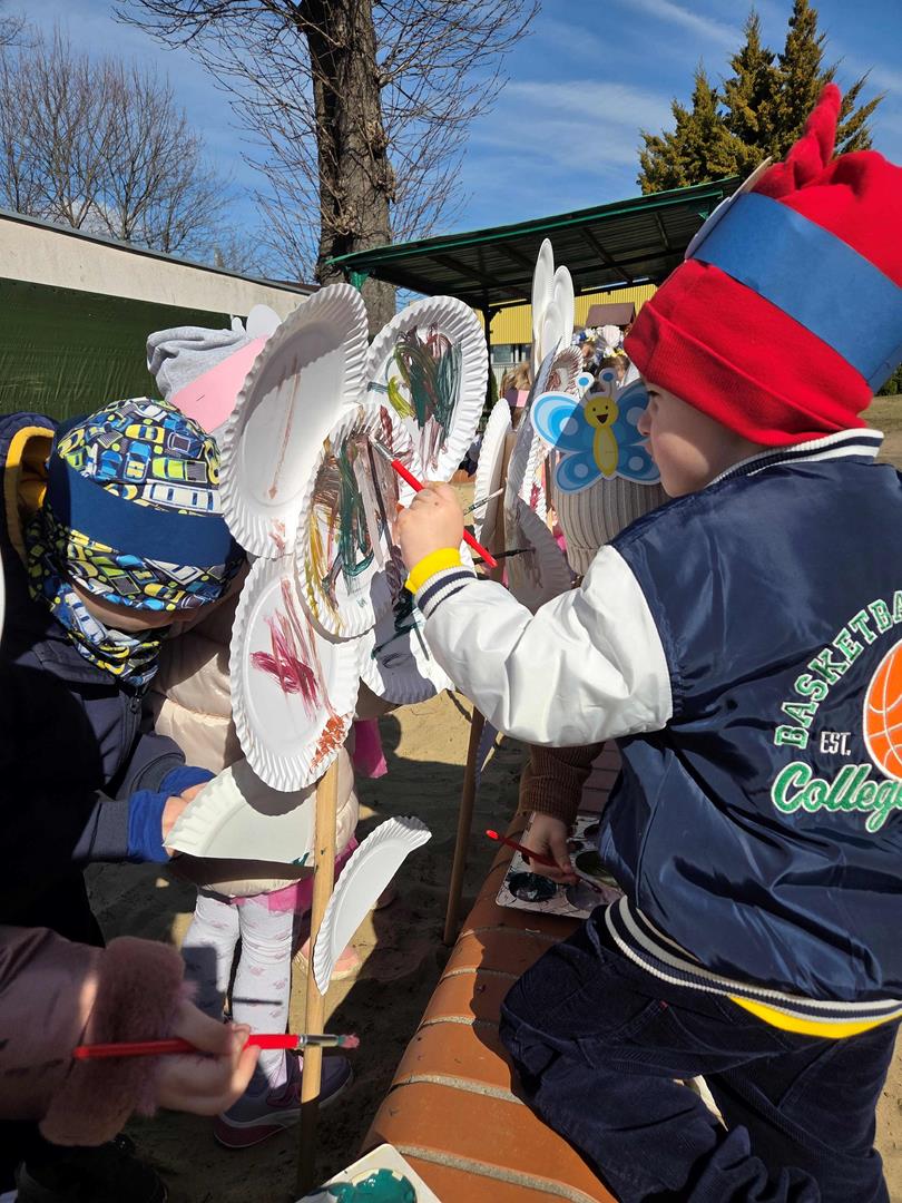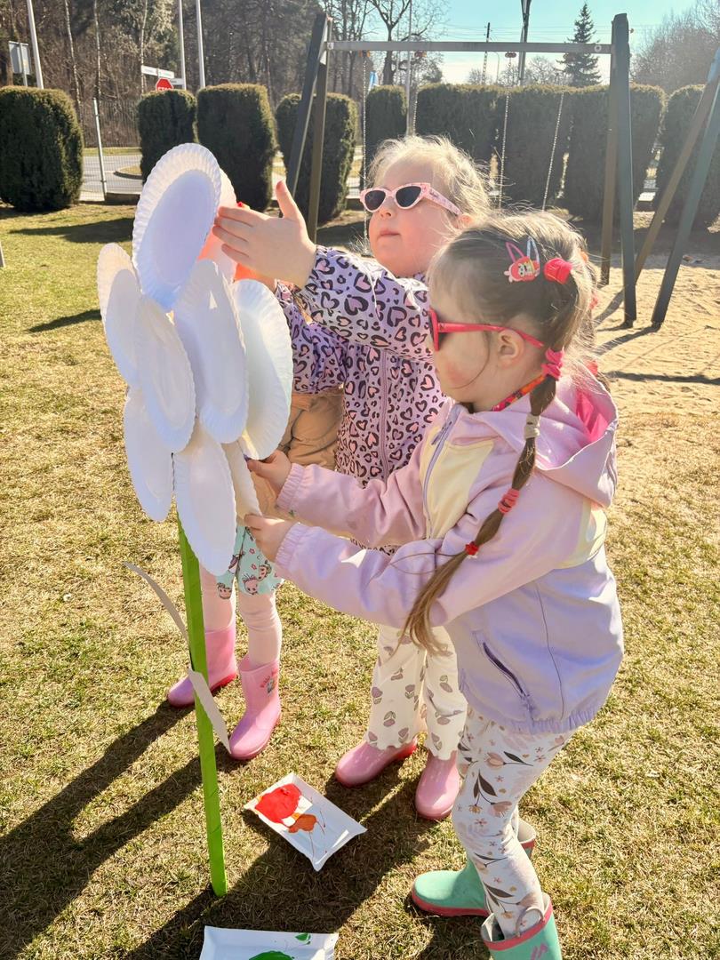 Równie ciekawie było w przedszkolu przy ul. Rolnej, gdzie dzieci wyruszyły w niezwykłą podróż w poszukiwaniu wiosny. Podczas tej wyprawy wykonywały różnorodne zadania – ozdabiały statek kolorowymi motylami, zbierały ryby i tworzyły z nich „ławice”, a następnie podróżowały statkiem do krainy Wiosny. Na ich drodze pojawiła się również kolorowa brama, przez którą musiały przejść, by dotrzeć na kwiecistą łąkę. Nie zabrakło także działań plastycznych – dzieci malowały kwiaty farbami, a wiosenny pochód z parasolkami oraz zabawa sensoryczna „wiosenny deszczyk” dostarczały im wielu radosnych wrażeń.