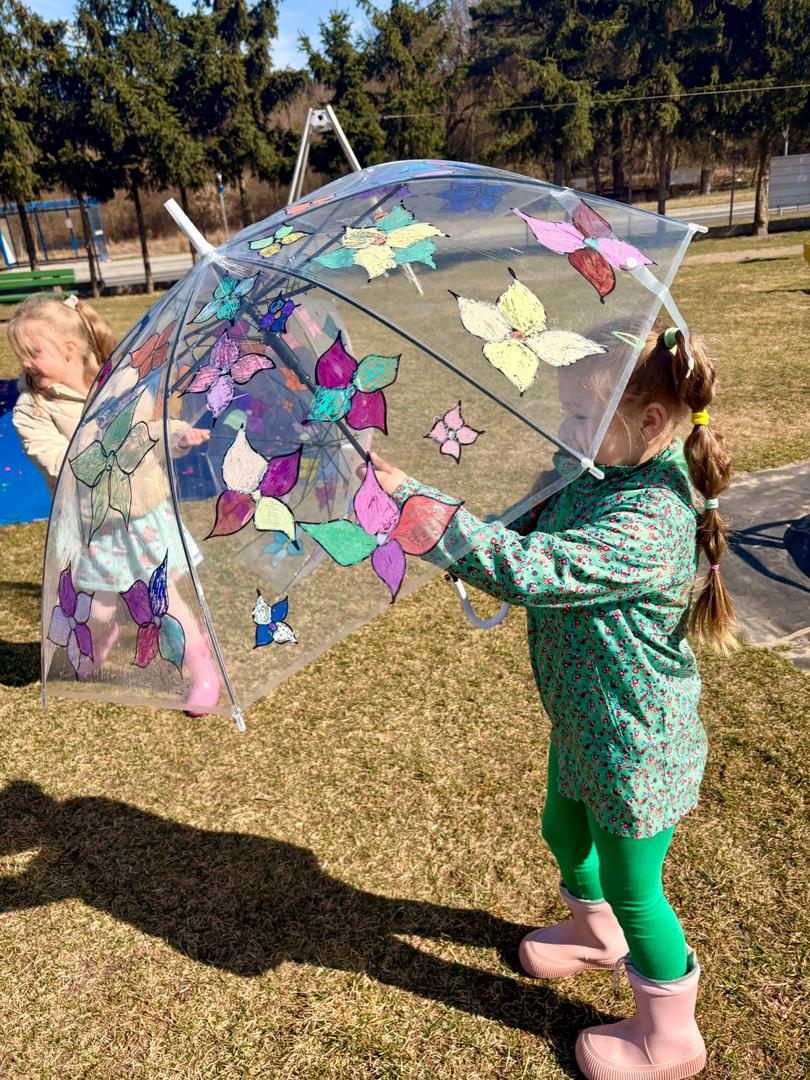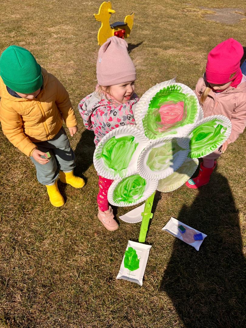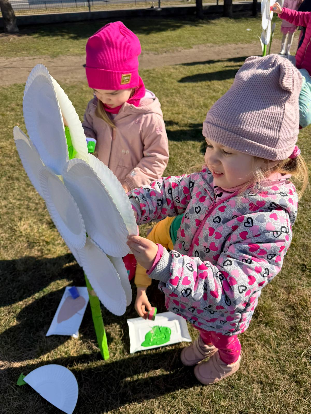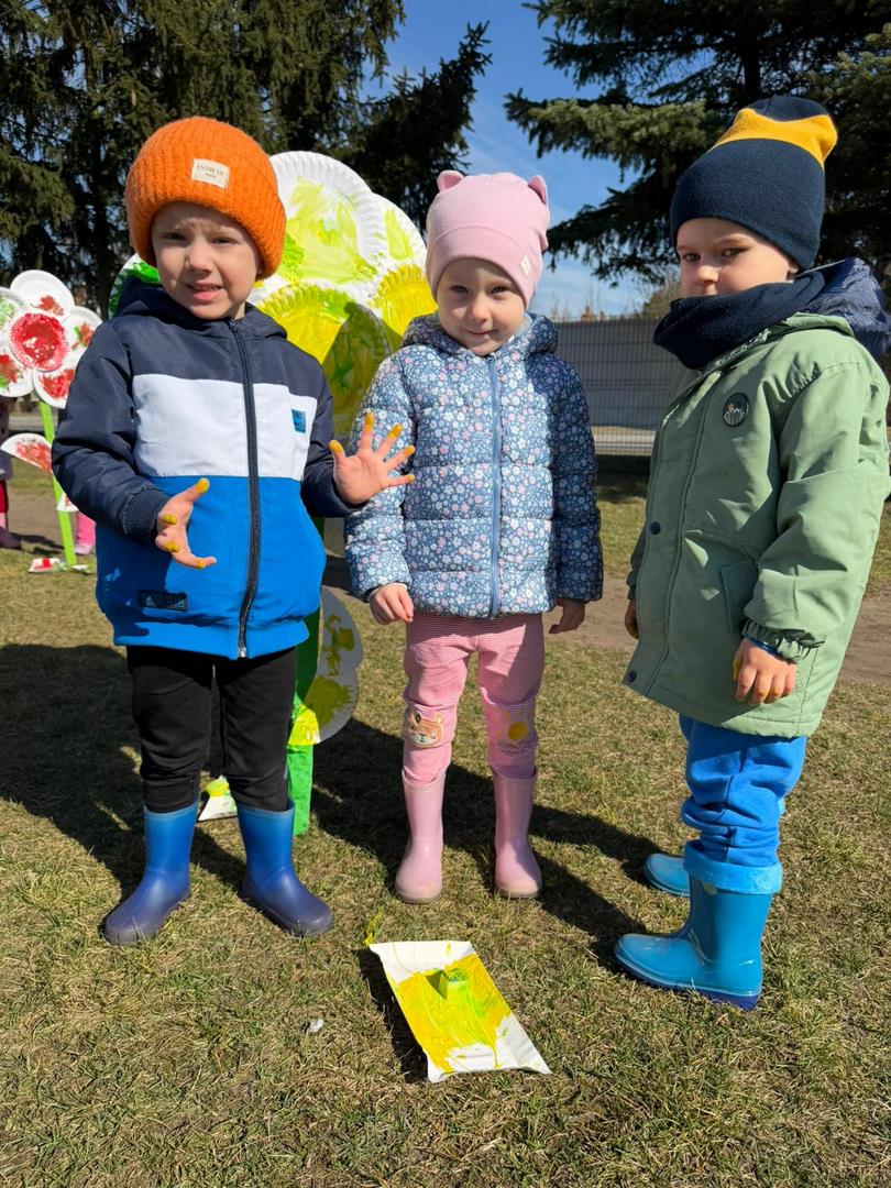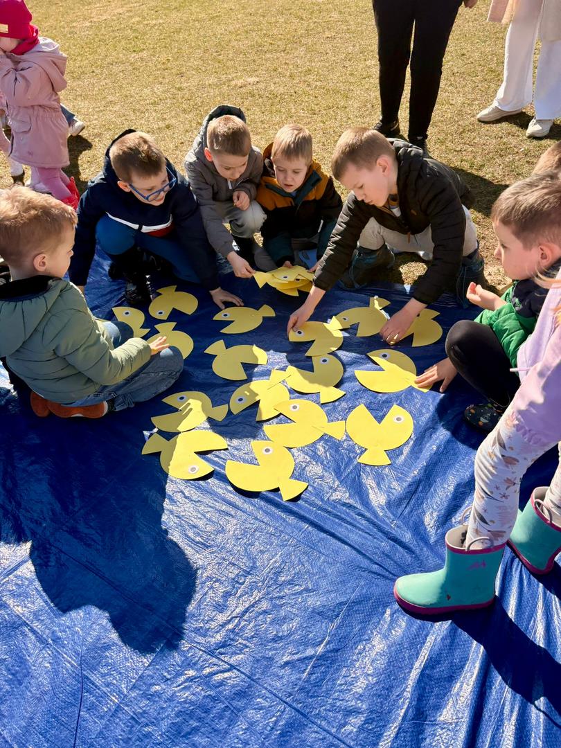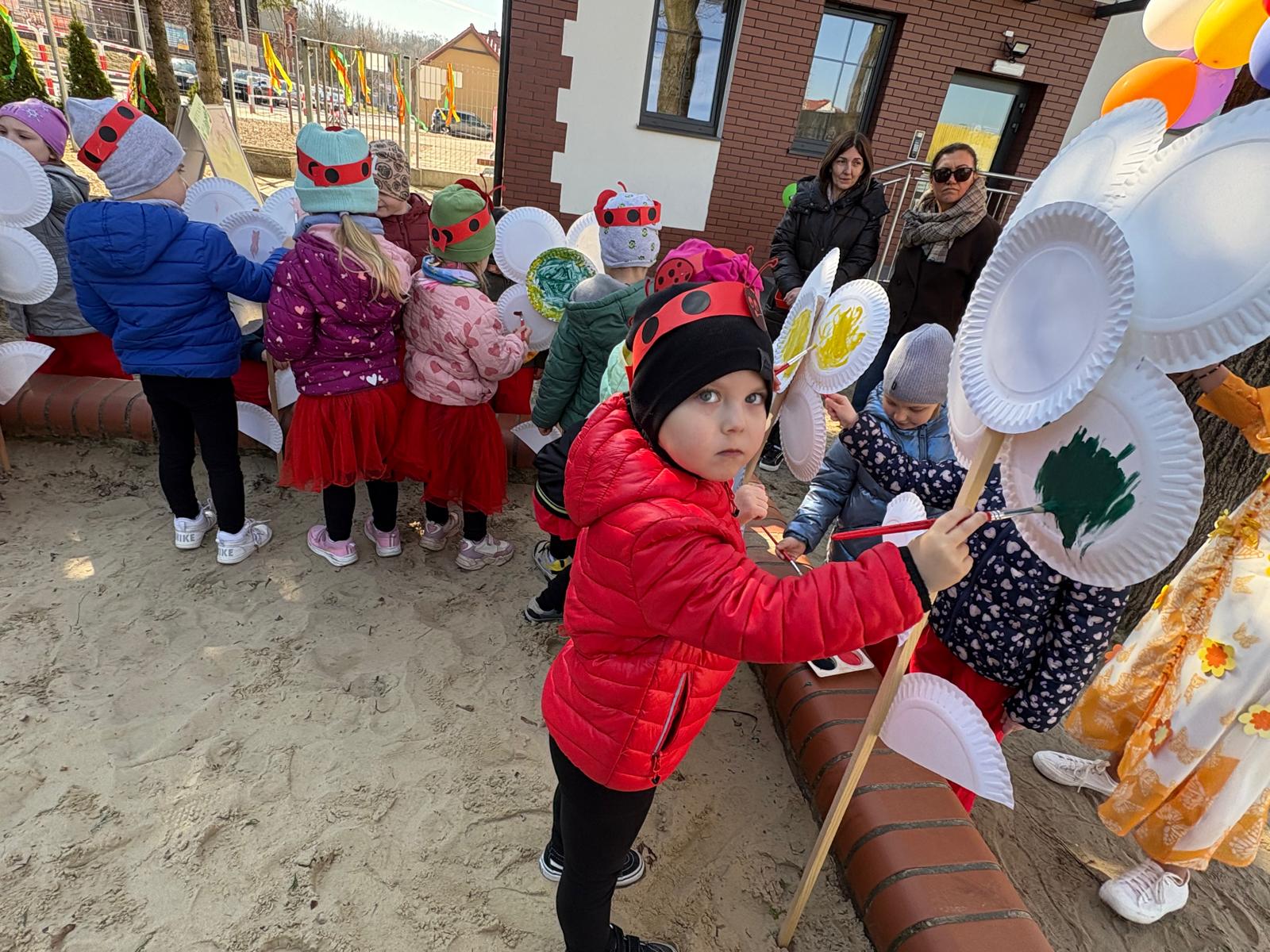 Równie ciekawie było w przedszkolu przy ul. Rolnej, gdzie dzieci wyruszyły w niezwykłą podróż w poszukiwaniu wiosny. Podczas tej wyprawy wykonywały różnorodne zadania – ozdabiały statek kolorowymi motylami, zbierały ryby i tworzyły z nich „ławice”, a następnie podróżowały statkiem do krainy Wiosny. Na ich drodze pojawiła się również kolorowa brama, przez którą musiały przejść, by dotrzeć na kwiecistą łąkę. Nie zabrakło także działań plastycznych – dzieci malowały kwiaty farbami, a wiosenny pochód z parasolkami oraz zabawa sensoryczna „wiosenny deszczyk” dostarczały im wielu radosnych wrażeń.