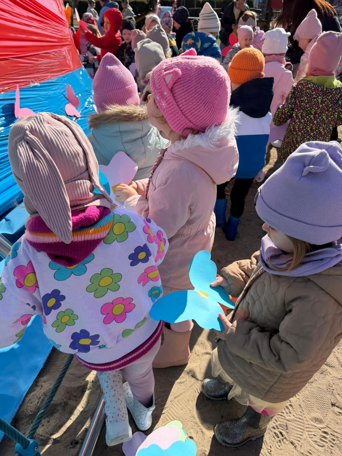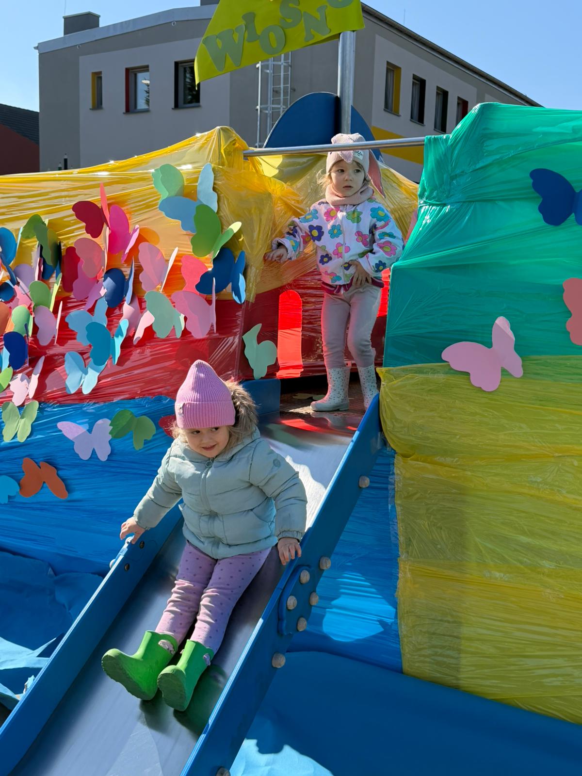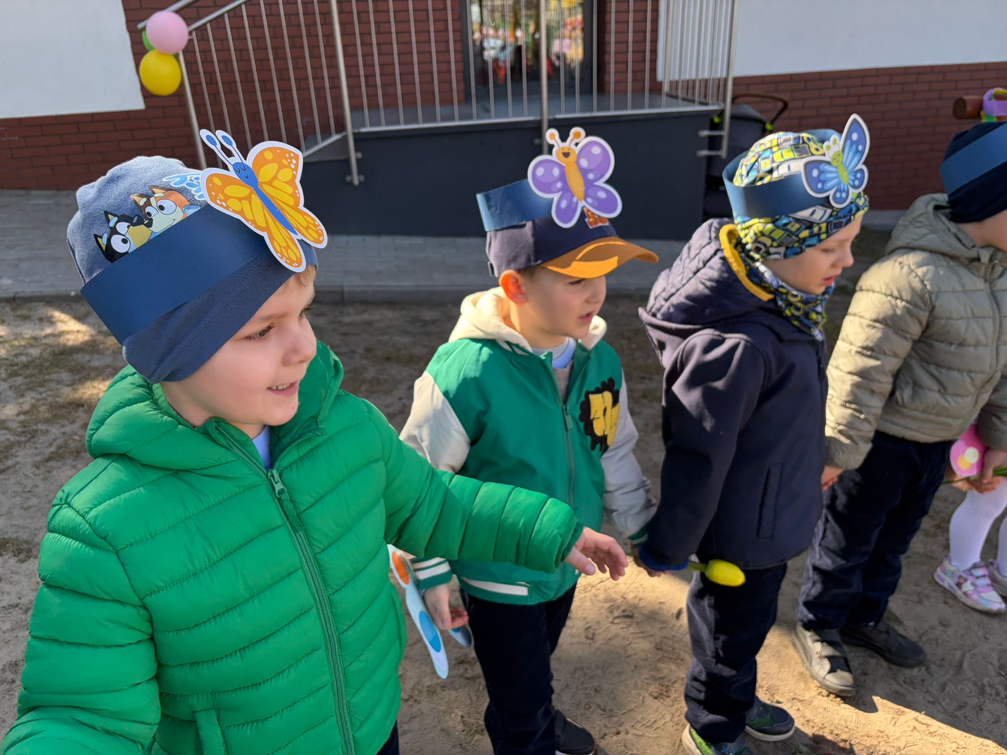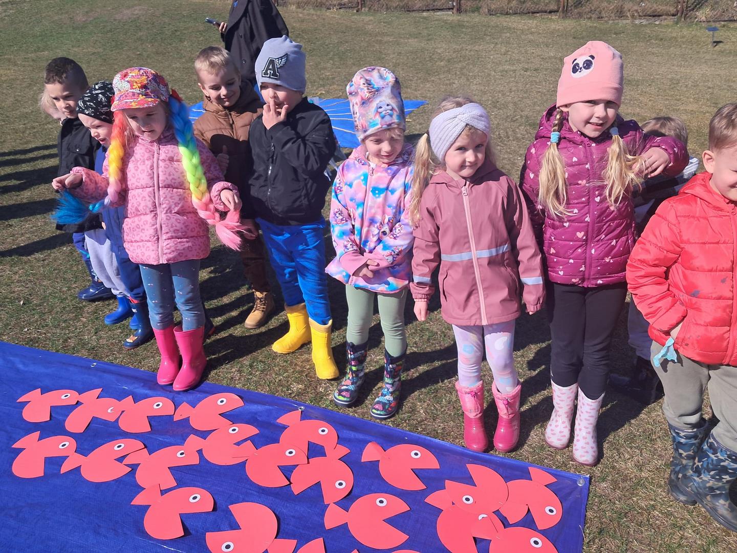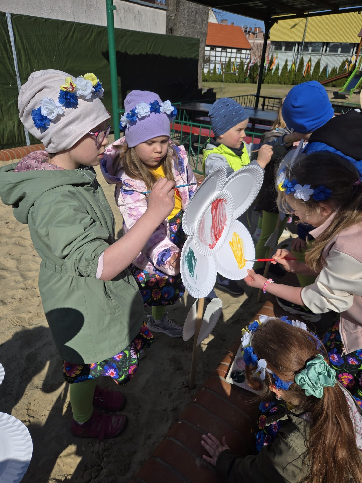 Równie ciekawie było w przedszkolu przy ul. Rolnej, gdzie dzieci wyruszyły w niezwykłą podróż w poszukiwaniu wiosny. Podczas tej wyprawy wykonywały różnorodne zadania – ozdabiały statek kolorowymi motylami, zbierały ryby i tworzyły z nich „ławice”, a następnie podróżowały statkiem do krainy Wiosny. Na ich drodze pojawiła się również kolorowa brama, przez którą musiały przejść, by dotrzeć na kwiecistą łąkę. Nie zabrakło także działań plastycznych – dzieci malowały kwiaty farbami, a wiosenny pochód z parasolkami oraz zabawa sensoryczna „wiosenny deszczyk” dostarczały im wielu radosnych wrażeń.