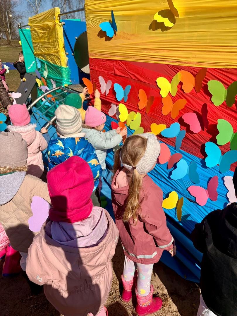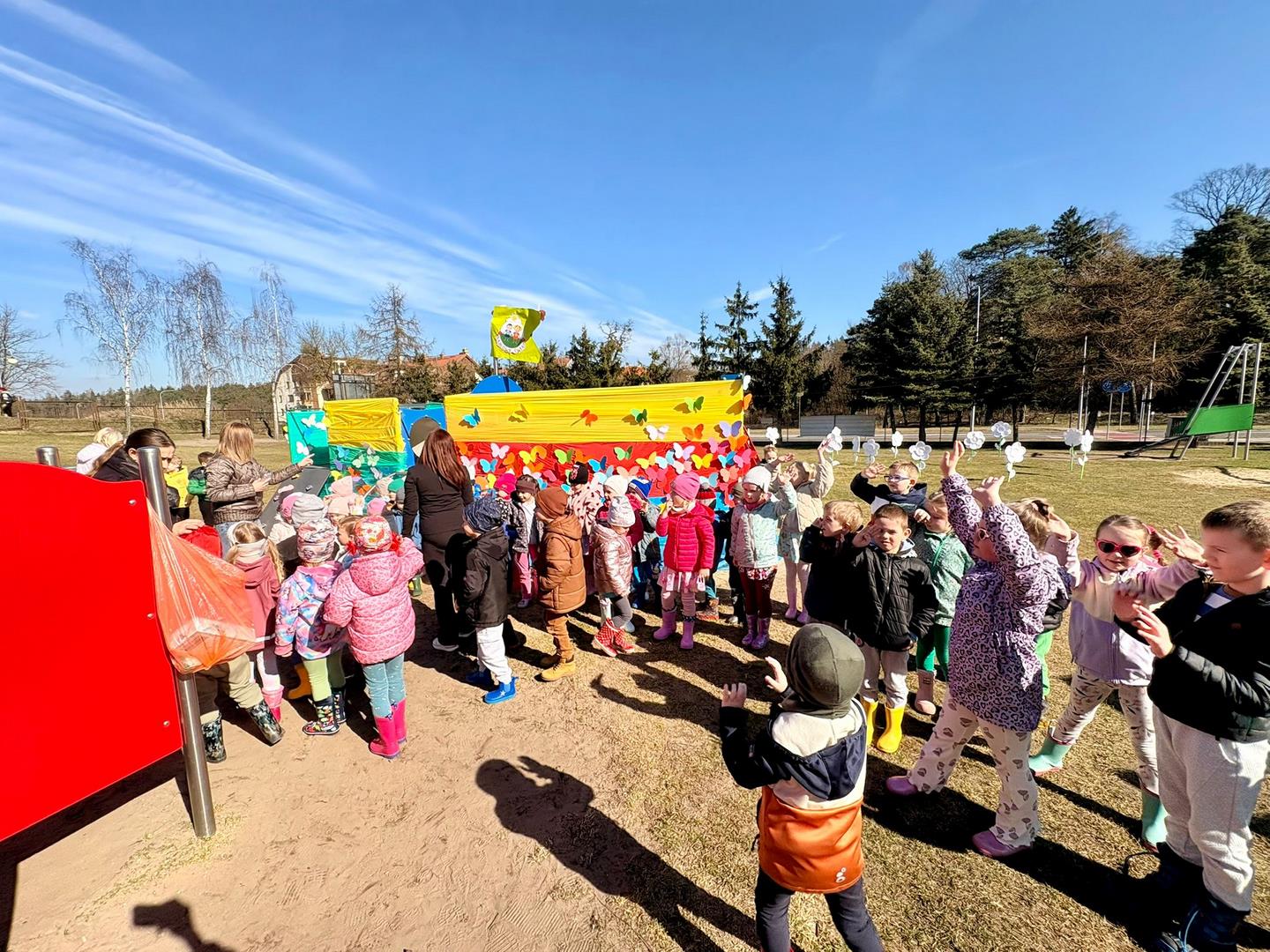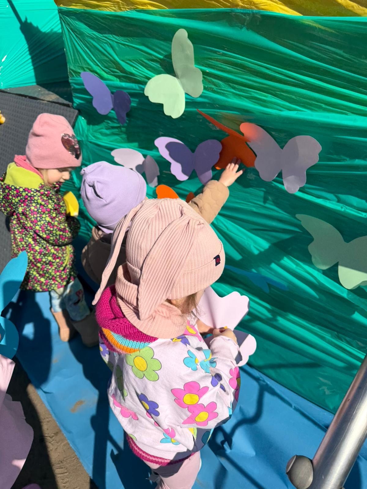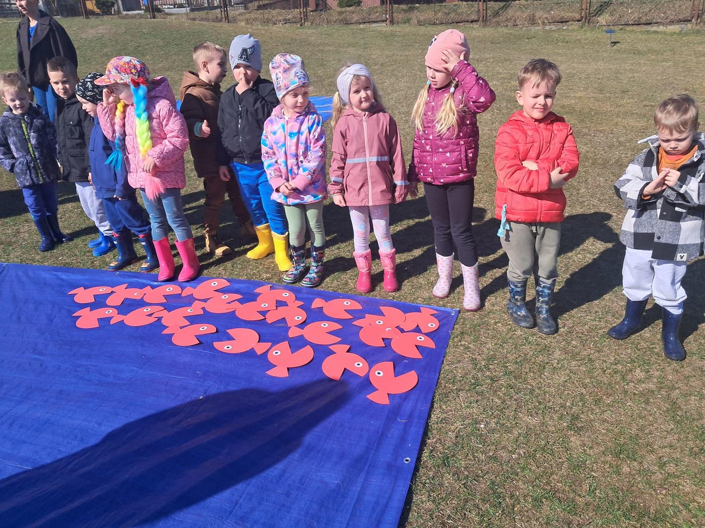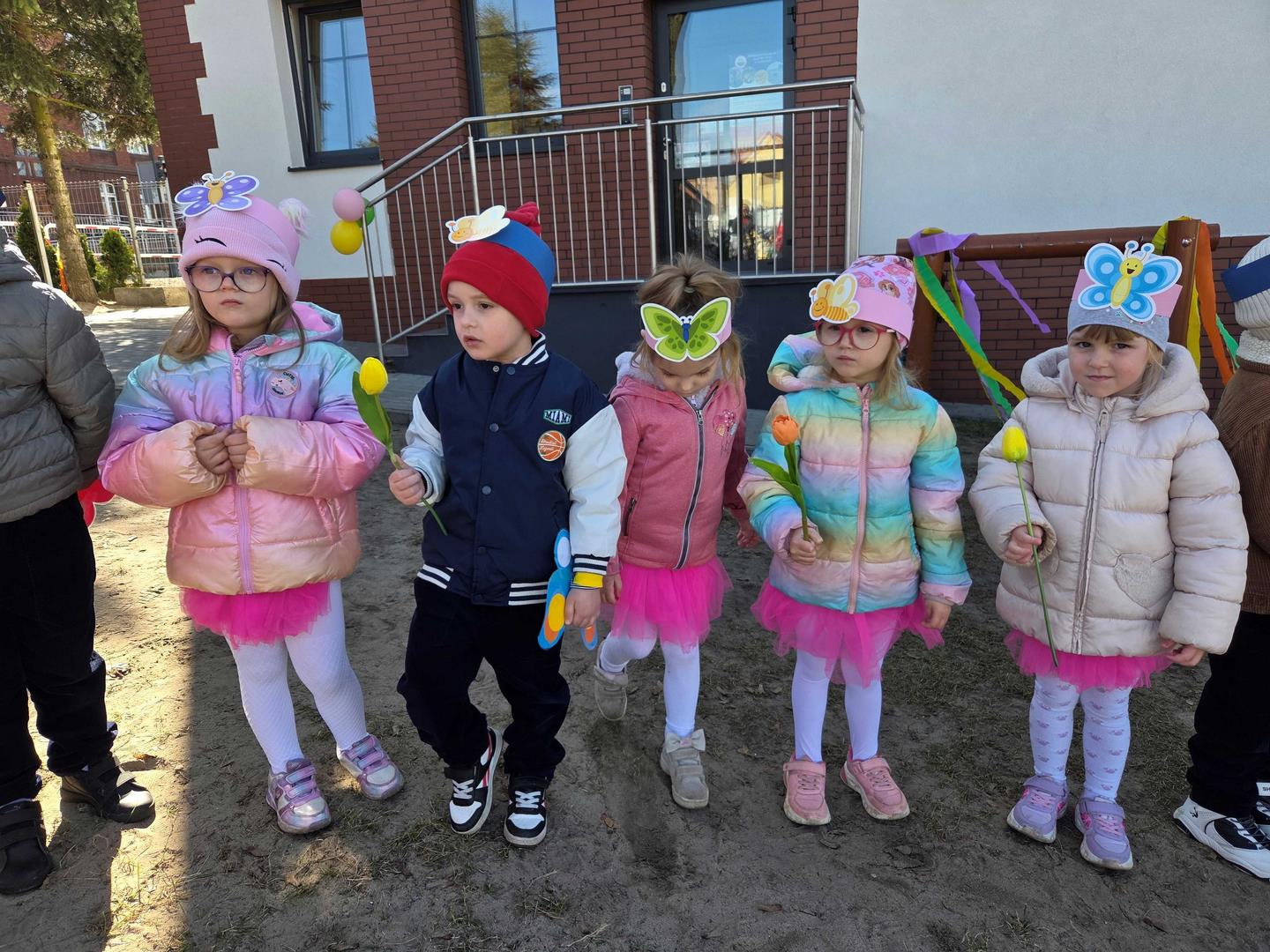 Równie ciekawie było w przedszkolu przy ul. Rolnej, gdzie dzieci wyruszyły w niezwykłą podróż w poszukiwaniu wiosny. Podczas tej wyprawy wykonywały różnorodne zadania – ozdabiały statek kolorowymi motylami, zbierały ryby i tworzyły z nich „ławice”, a następnie podróżowały statkiem do krainy Wiosny. Na ich drodze pojawiła się również kolorowa brama, przez którą musiały przejść, by dotrzeć na kwiecistą łąkę. Nie zabrakło także działań plastycznych – dzieci malowały kwiaty farbami, a wiosenny pochód z parasolkami oraz zabawa sensoryczna „wiosenny deszczyk” dostarczały im wielu radosnych wrażeń.