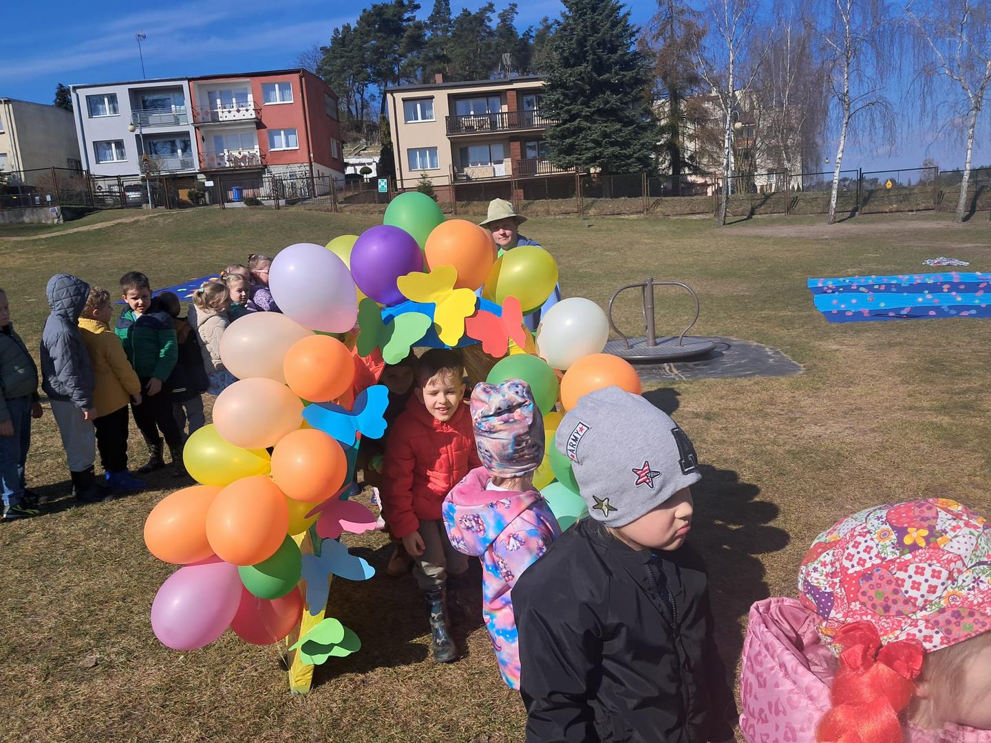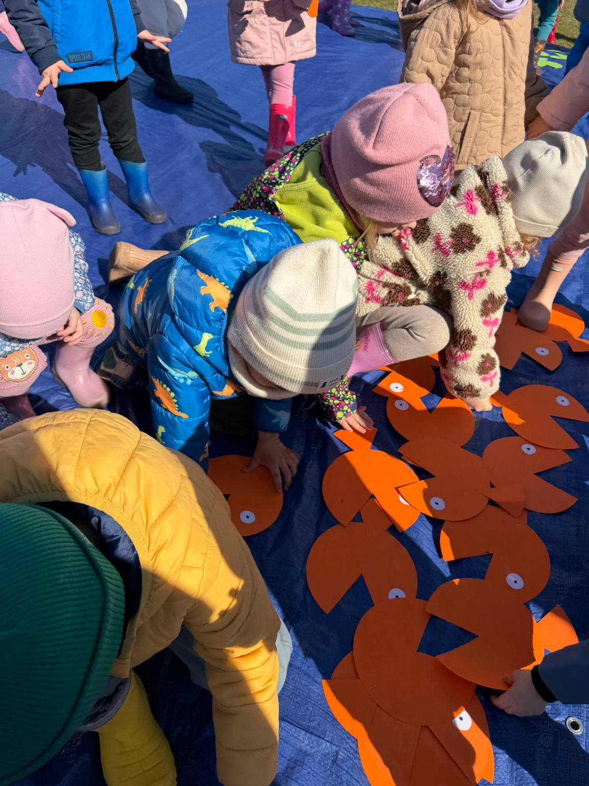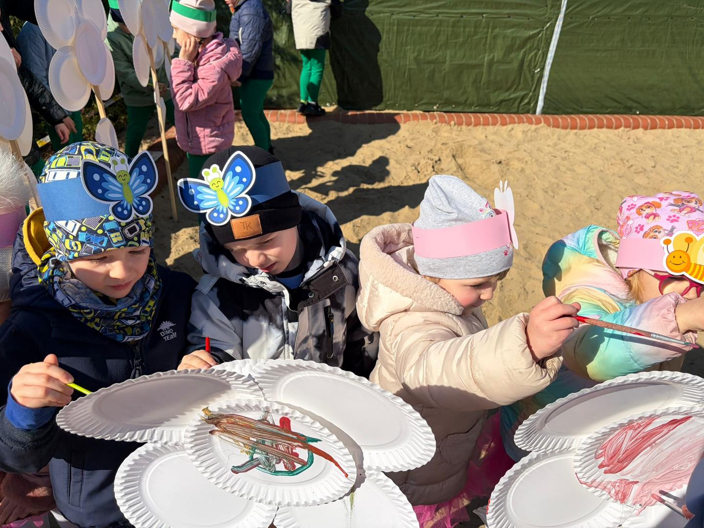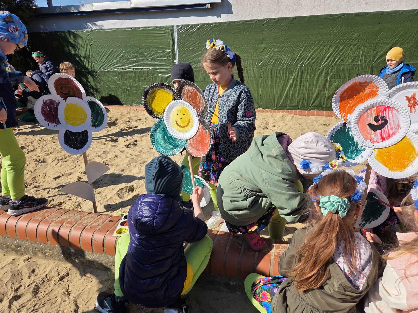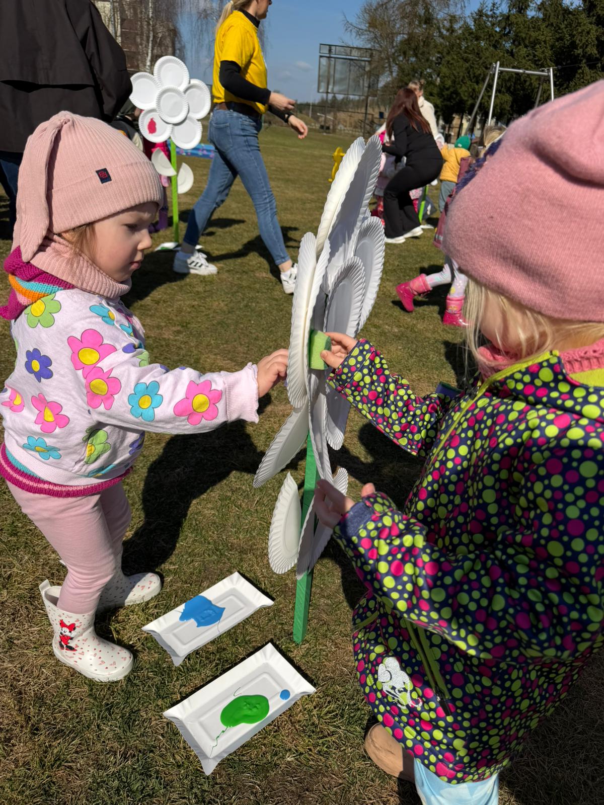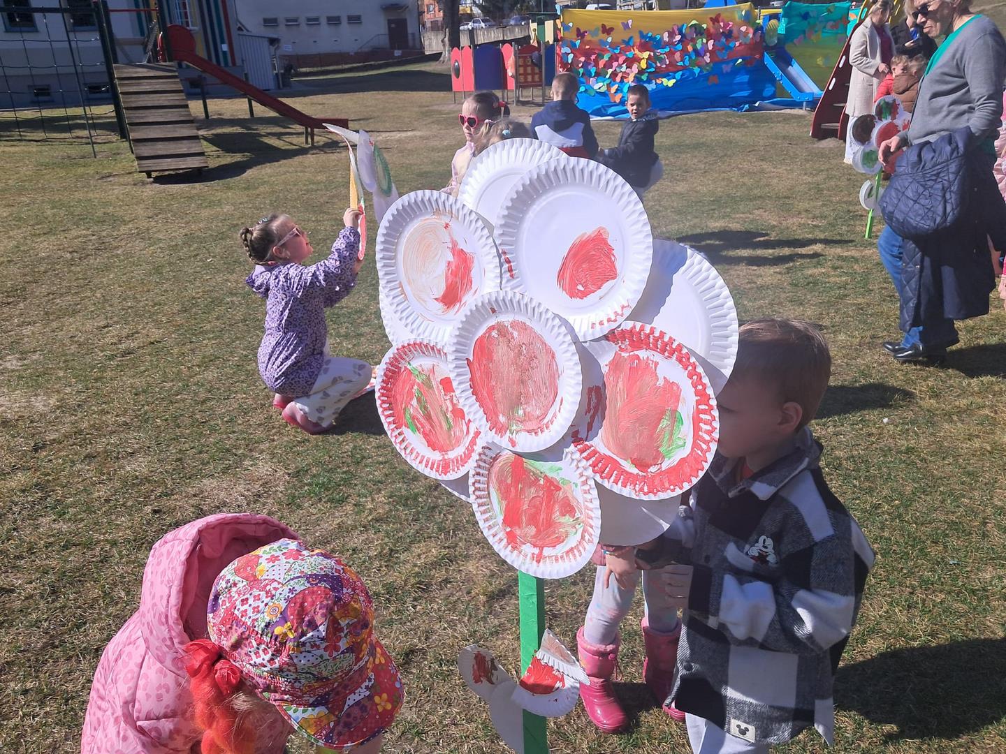 Równie ciekawie było w przedszkolu przy ul. Rolnej, gdzie dzieci wyruszyły w niezwykłą podróż w poszukiwaniu wiosny. Podczas tej wyprawy wykonywały różnorodne zadania – ozdabiały statek kolorowymi motylami, zbierały ryby i tworzyły z nich „ławice”, a następnie podróżowały statkiem do krainy Wiosny. Na ich drodze pojawiła się również kolorowa brama, przez którą musiały przejść, by dotrzeć na kwiecistą łąkę. Nie zabrakło także działań plastycznych – dzieci malowały kwiaty farbami, a wiosenny pochód z parasolkami oraz zabawa sensoryczna „wiosenny deszczyk” dostarczały im wielu radosnych wrażeń.