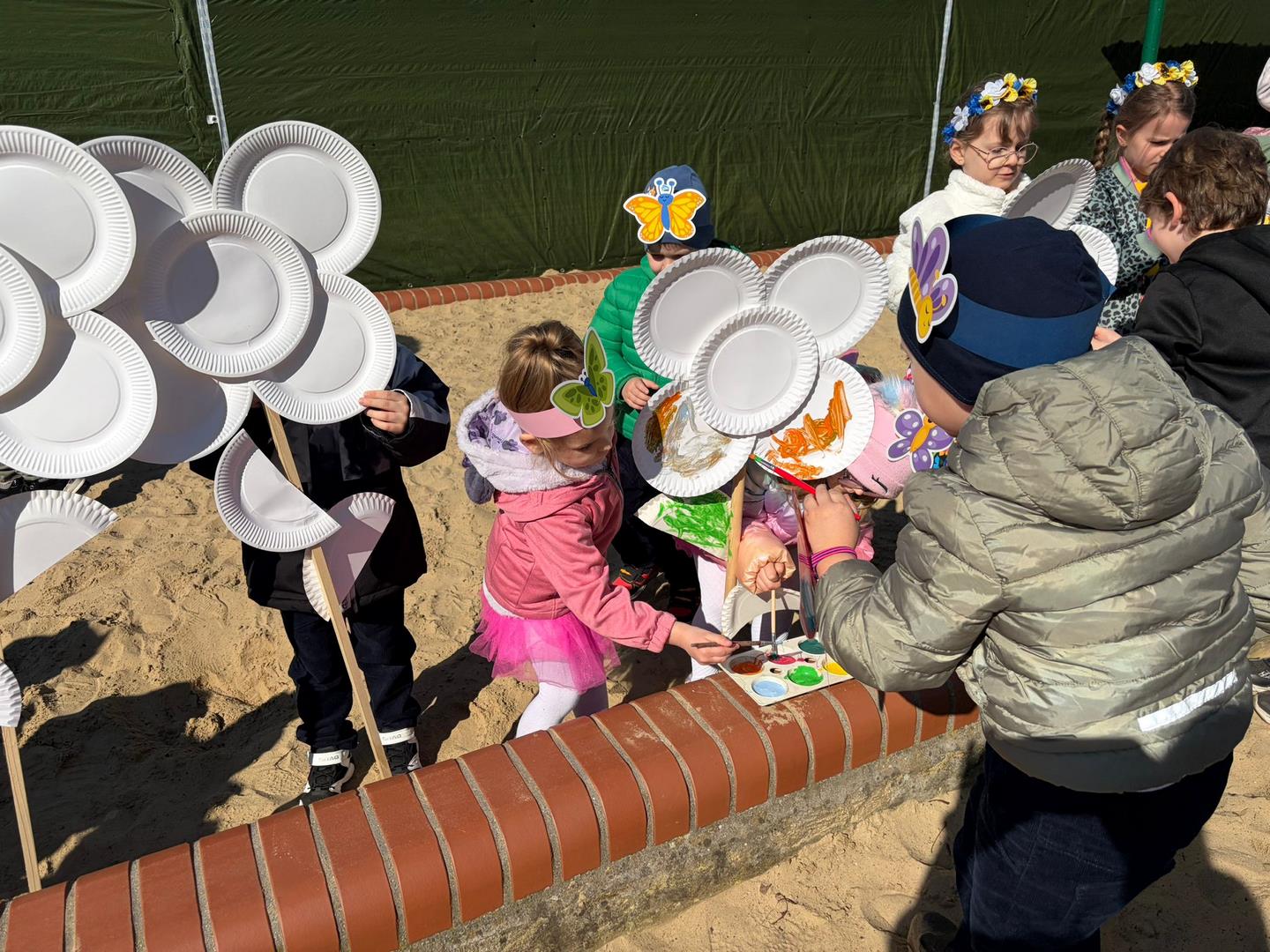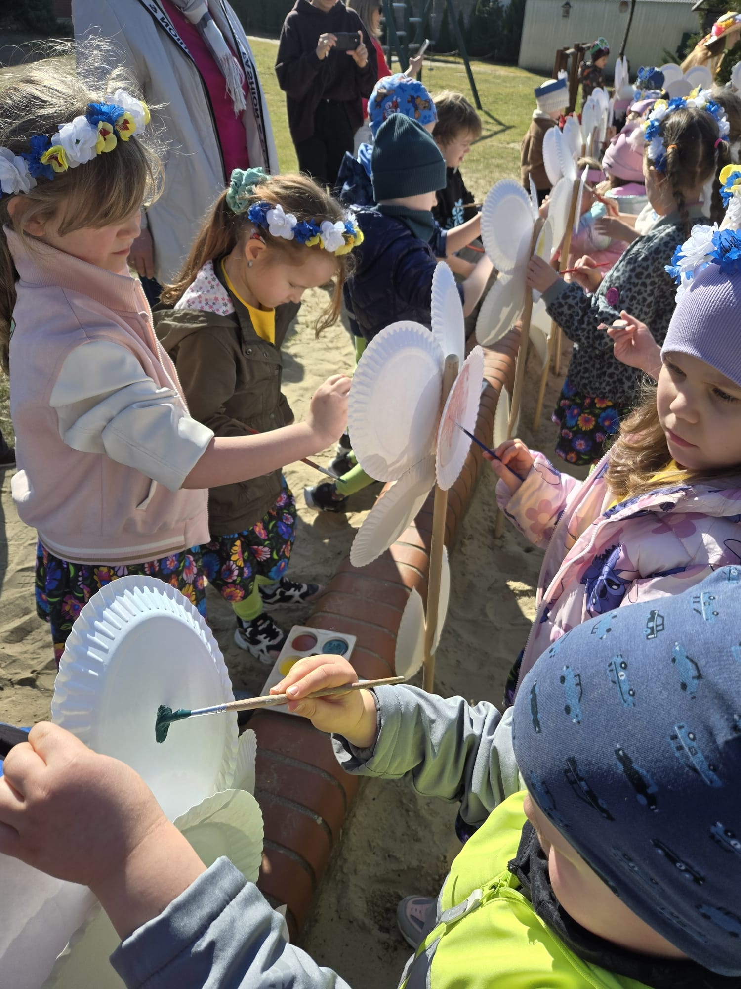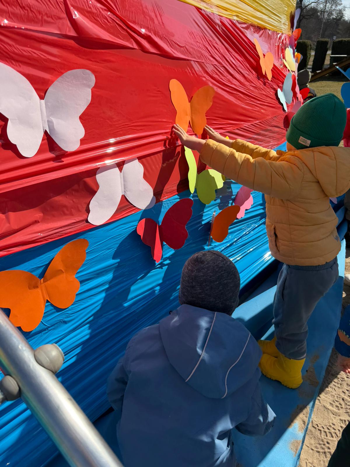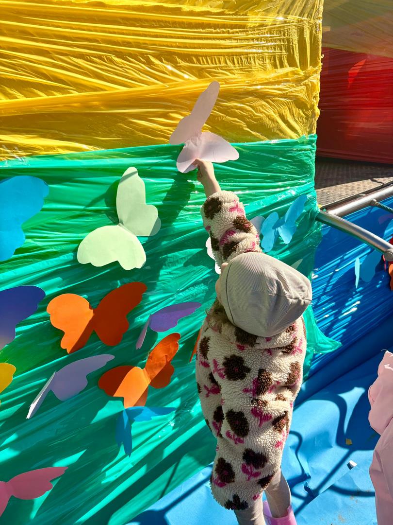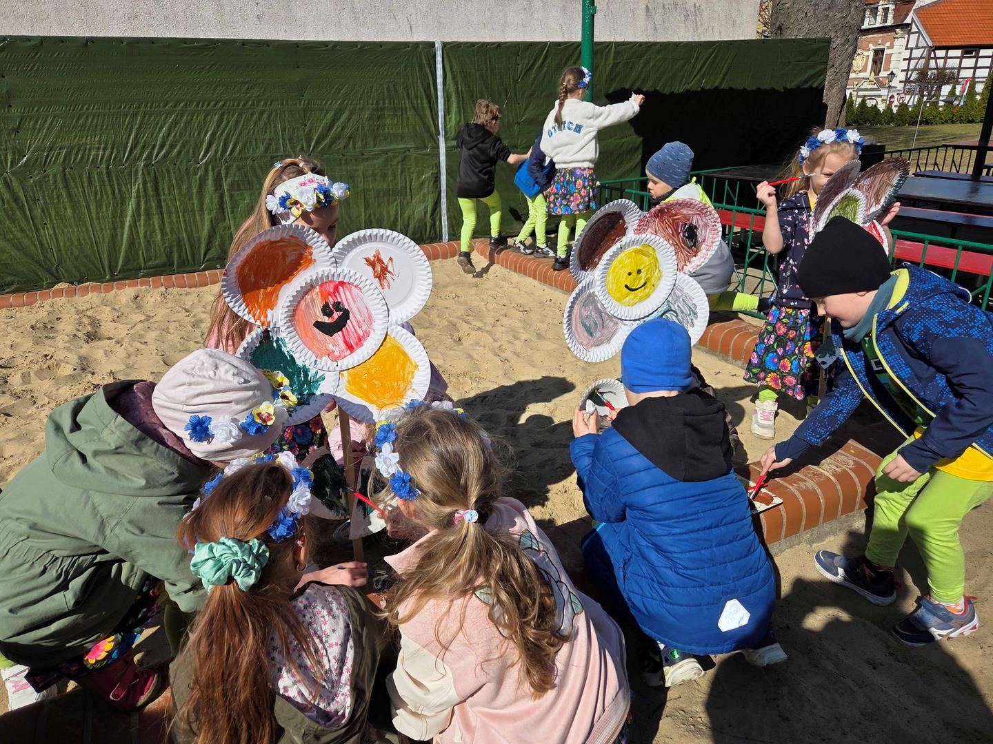 Równie ciekawie było w przedszkolu przy ul. Rolnej, gdzie dzieci wyruszyły w niezwykłą podróż w poszukiwaniu wiosny. Podczas tej wyprawy wykonywały różnorodne zadania – ozdabiały statek kolorowymi motylami, zbierały ryby i tworzyły z nich „ławice”, a następnie podróżowały statkiem do krainy Wiosny. Na ich drodze pojawiła się również kolorowa brama, przez którą musiały przejść, by dotrzeć na kwiecistą łąkę. Nie zabrakło także działań plastycznych – dzieci malowały kwiaty farbami, a wiosenny pochód z parasolkami oraz zabawa sensoryczna „wiosenny deszczyk” dostarczały im wielu radosnych wrażeń.