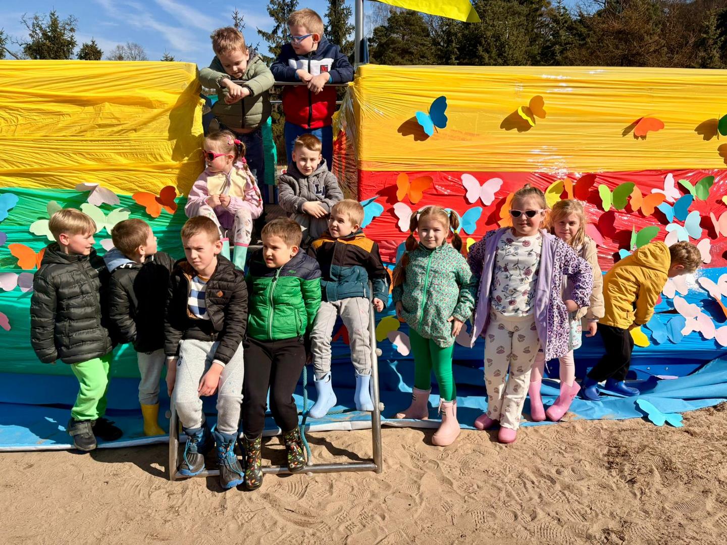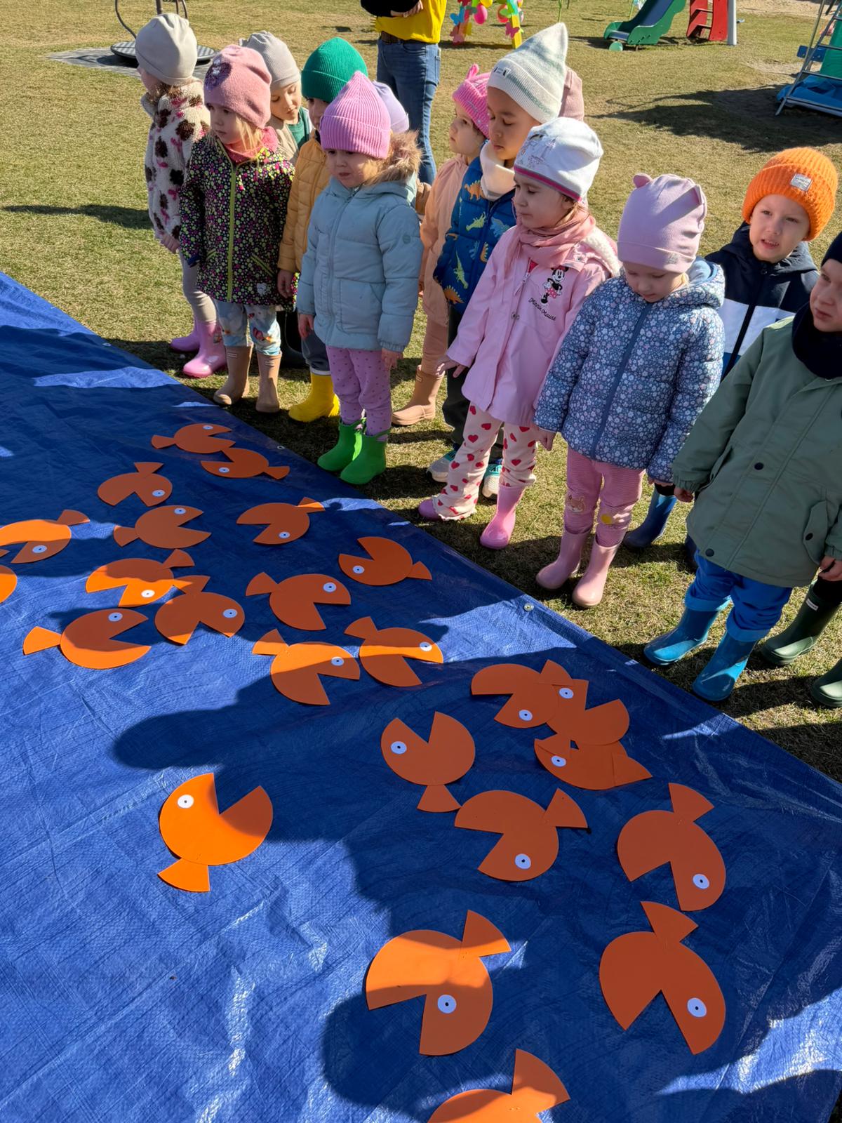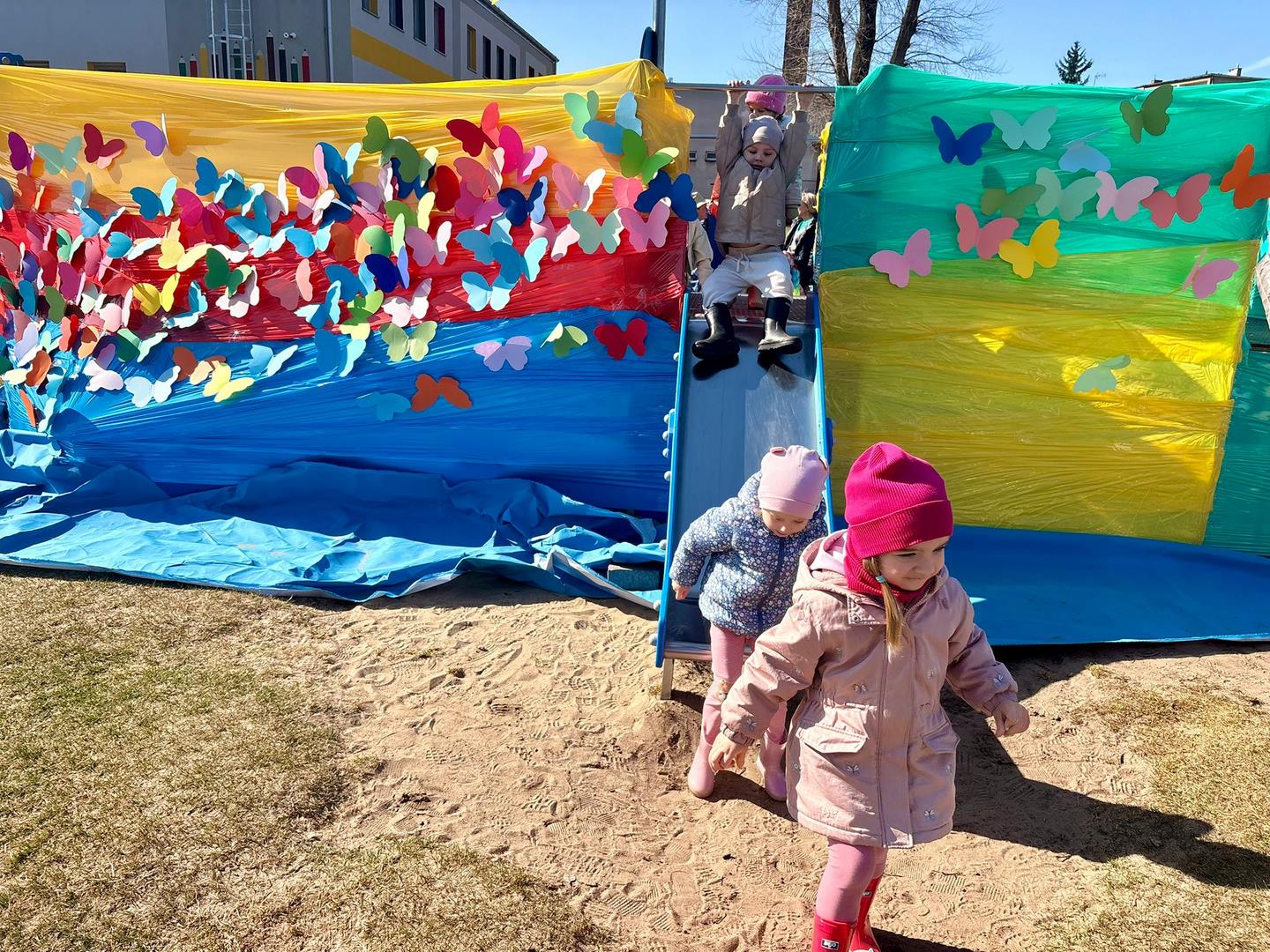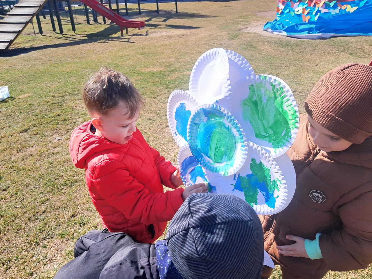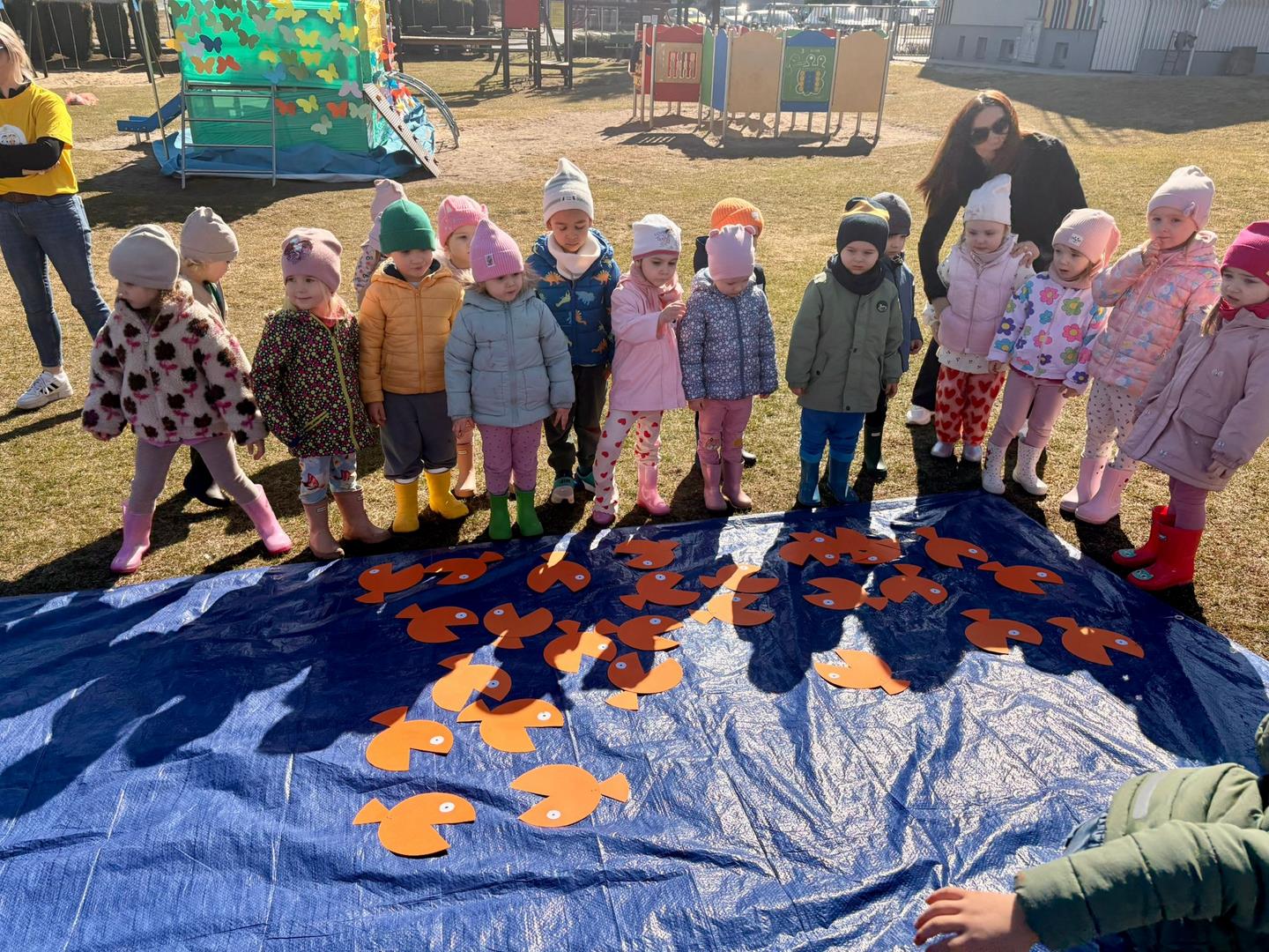 Równie ciekawie było w przedszkolu przy ul. Rolnej, gdzie dzieci wyruszyły w niezwykłą podróż w poszukiwaniu wiosny. Podczas tej wyprawy wykonywały różnorodne zadania – ozdabiały statek kolorowymi motylami, zbierały ryby i tworzyły z nich „ławice”, a następnie podróżowały statkiem do krainy Wiosny. Na ich drodze pojawiła się również kolorowa brama, przez którą musiały przejść, by dotrzeć na kwiecistą łąkę. Nie zabrakło także działań plastycznych – dzieci malowały kwiaty farbami, a wiosenny pochód z parasolkami oraz zabawa sensoryczna „wiosenny deszczyk” dostarczały im wielu radosnych wrażeń.