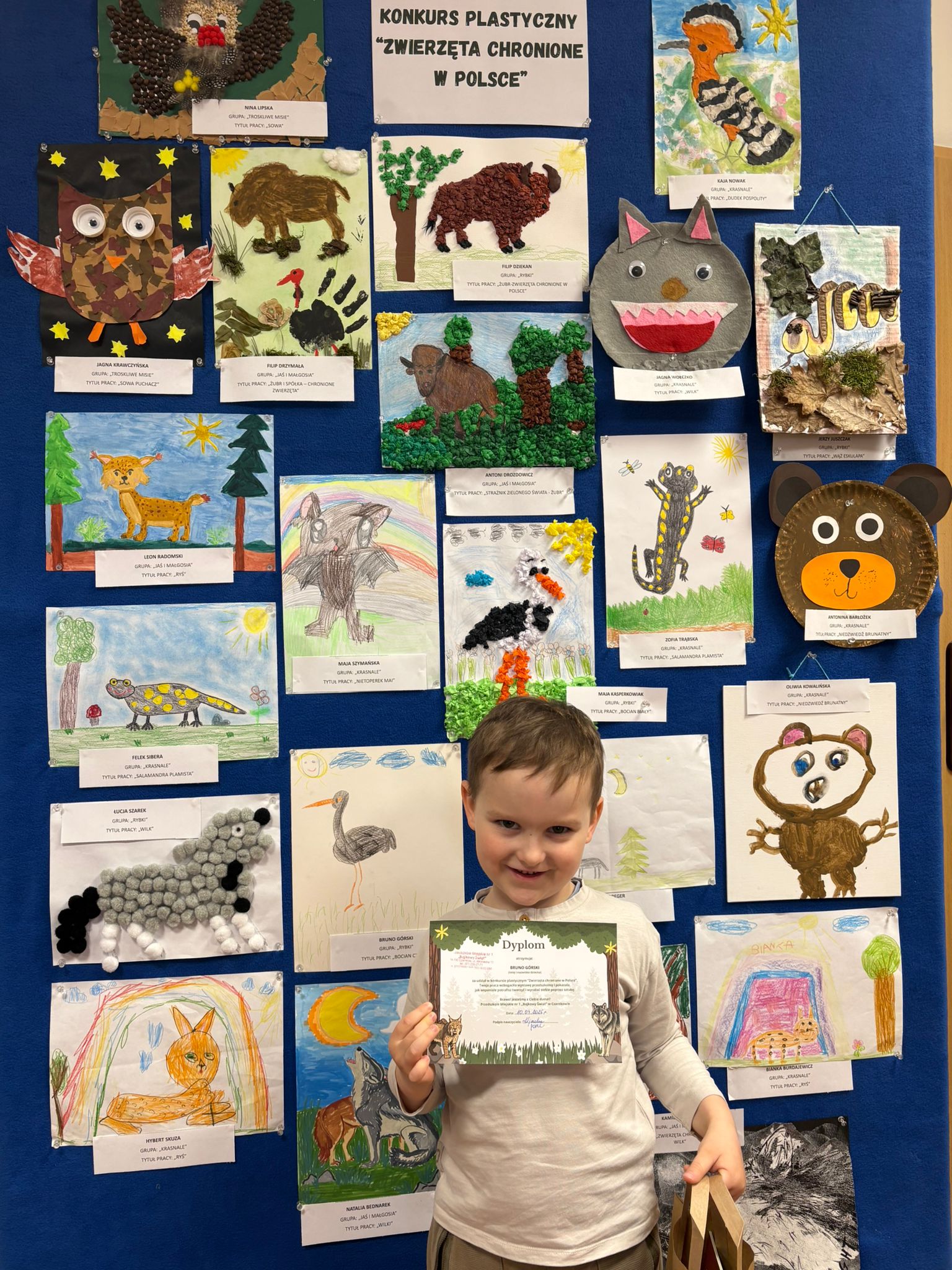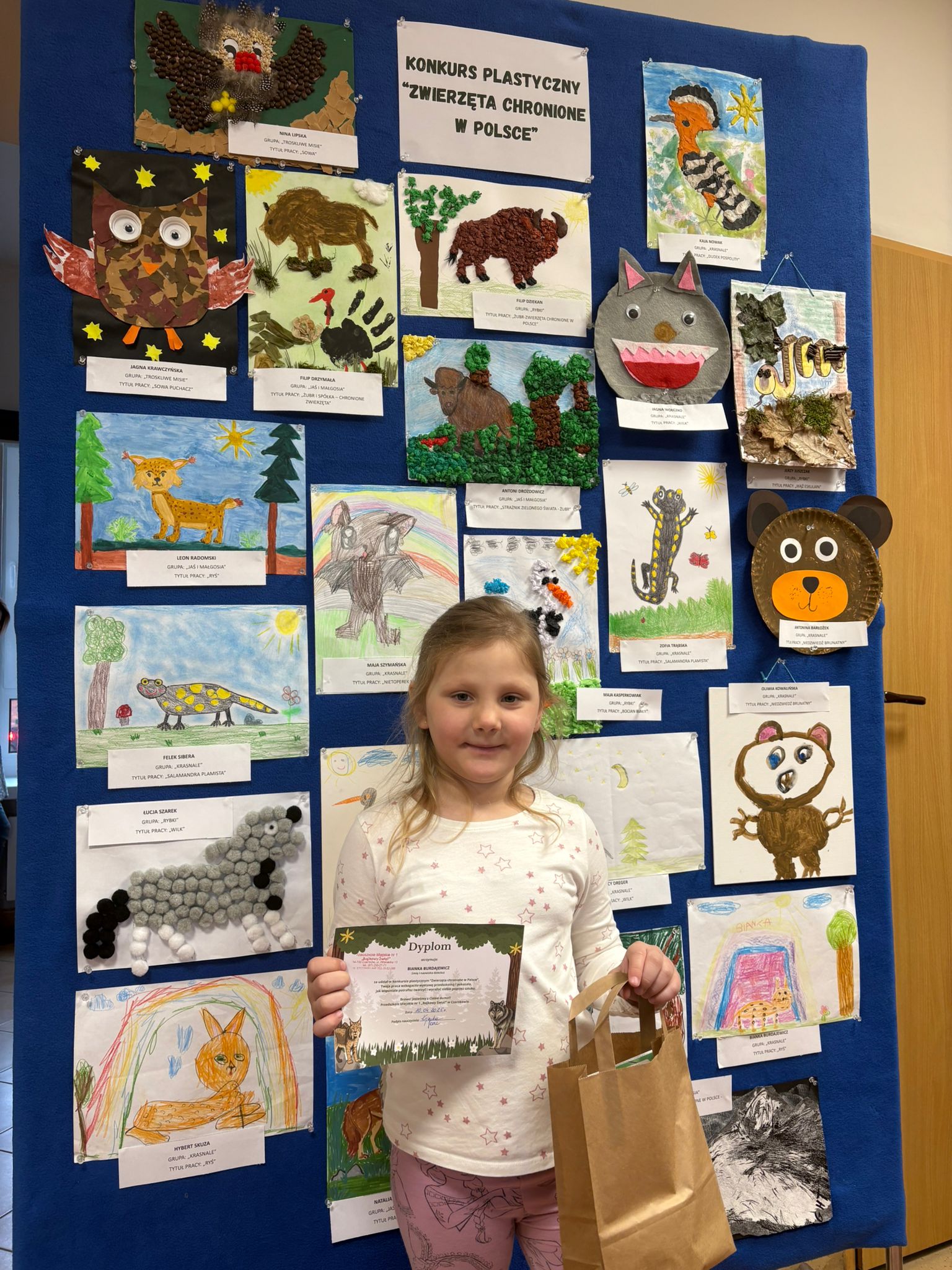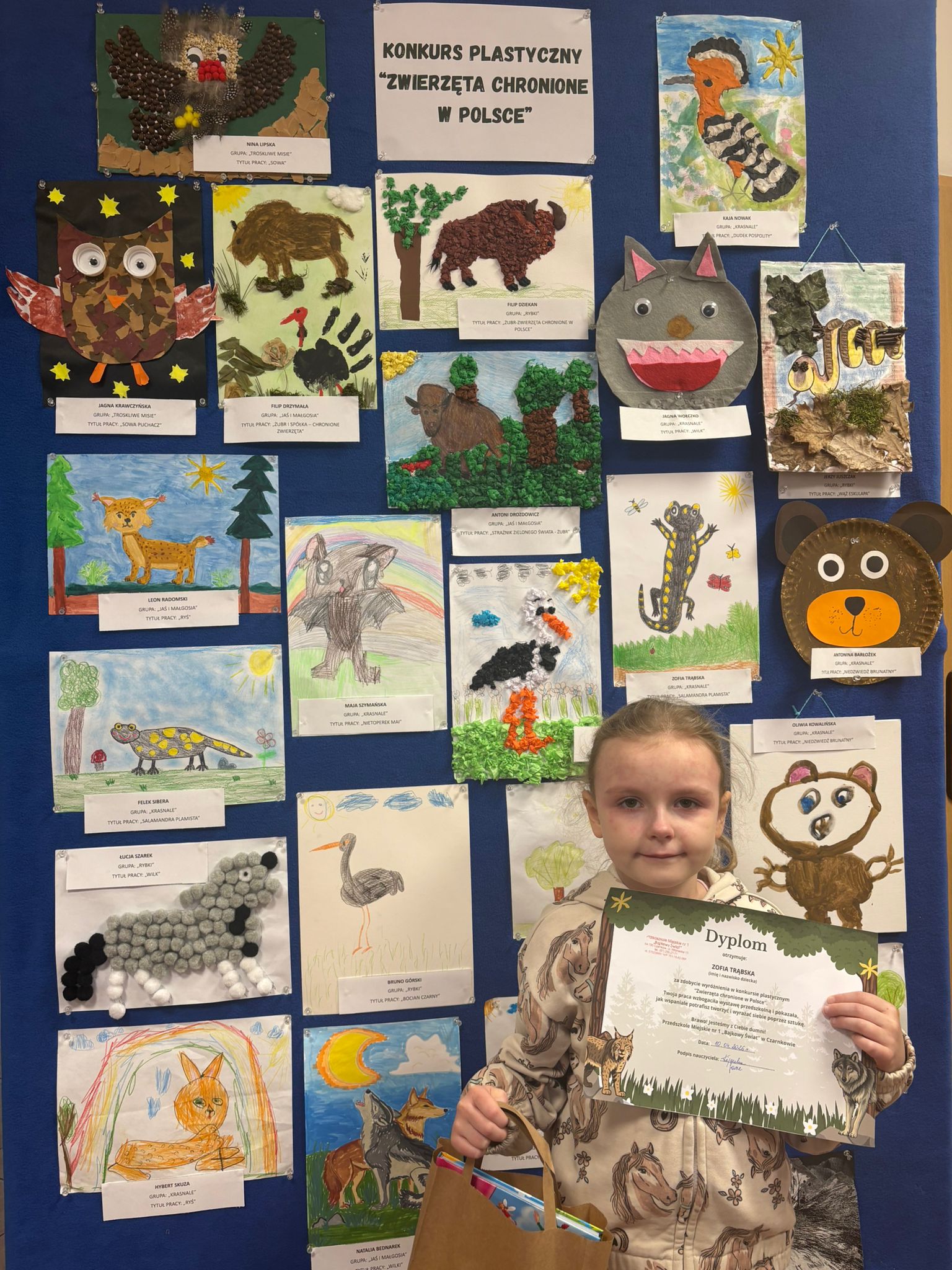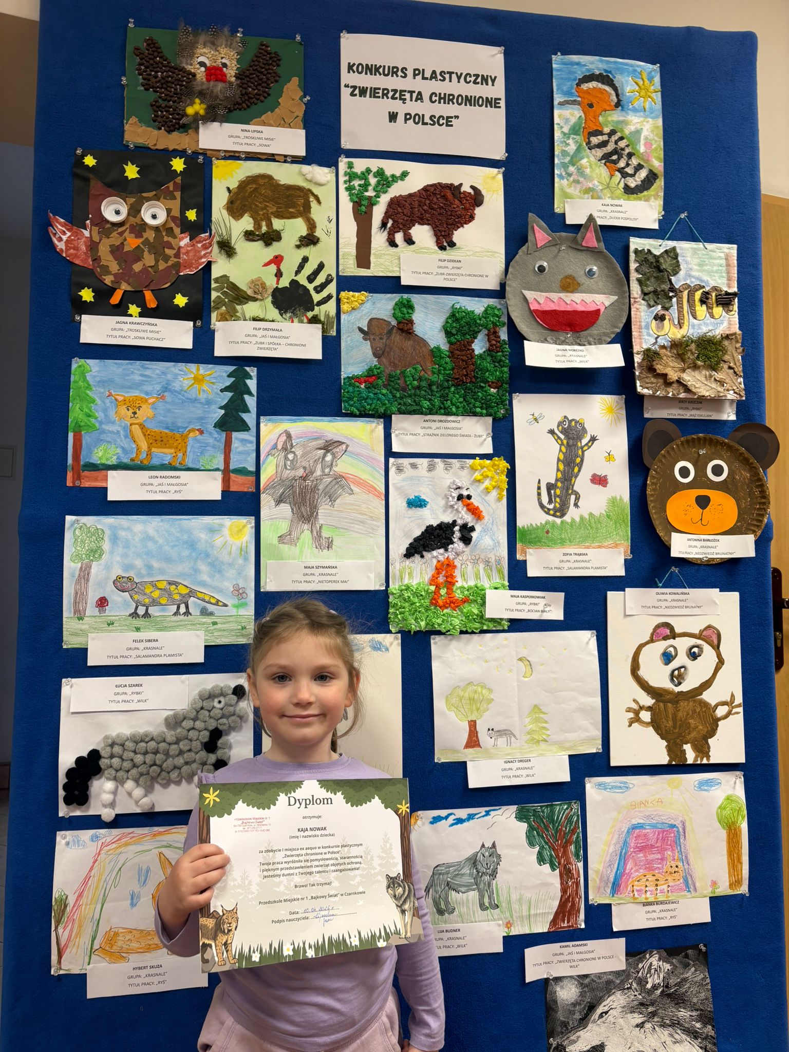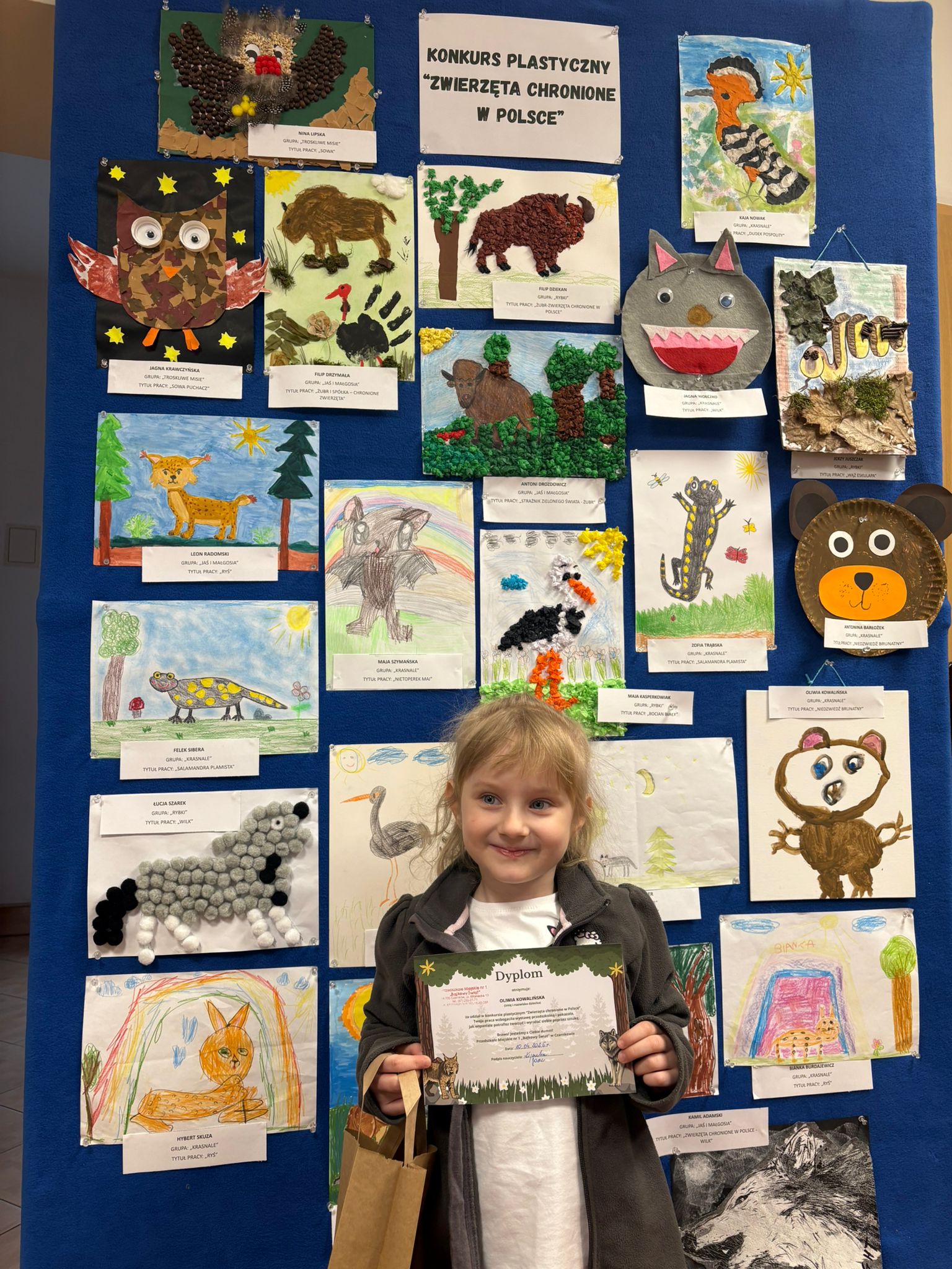 W konkursie plastycznym skierowanym do dzieci z grup 4 i 5‑letnich pt. „Zwierzęta chronione w Polsce” udział wzięło 23 dzieci. Celem głównym konkursu było przedstawienie wybranego gatunku zwierzęcia objętego ochroną w Polsce w formie pracy plastycznej.