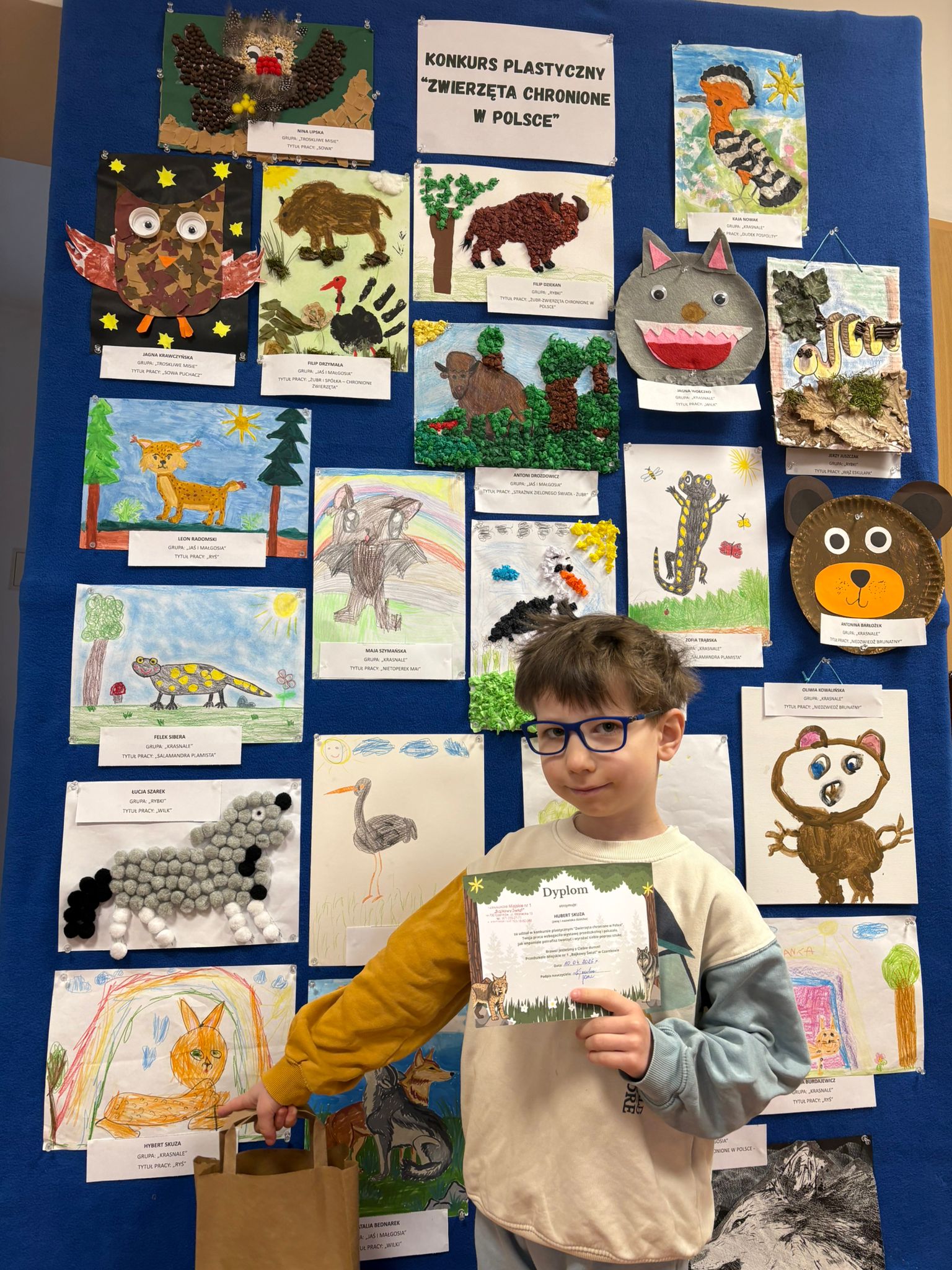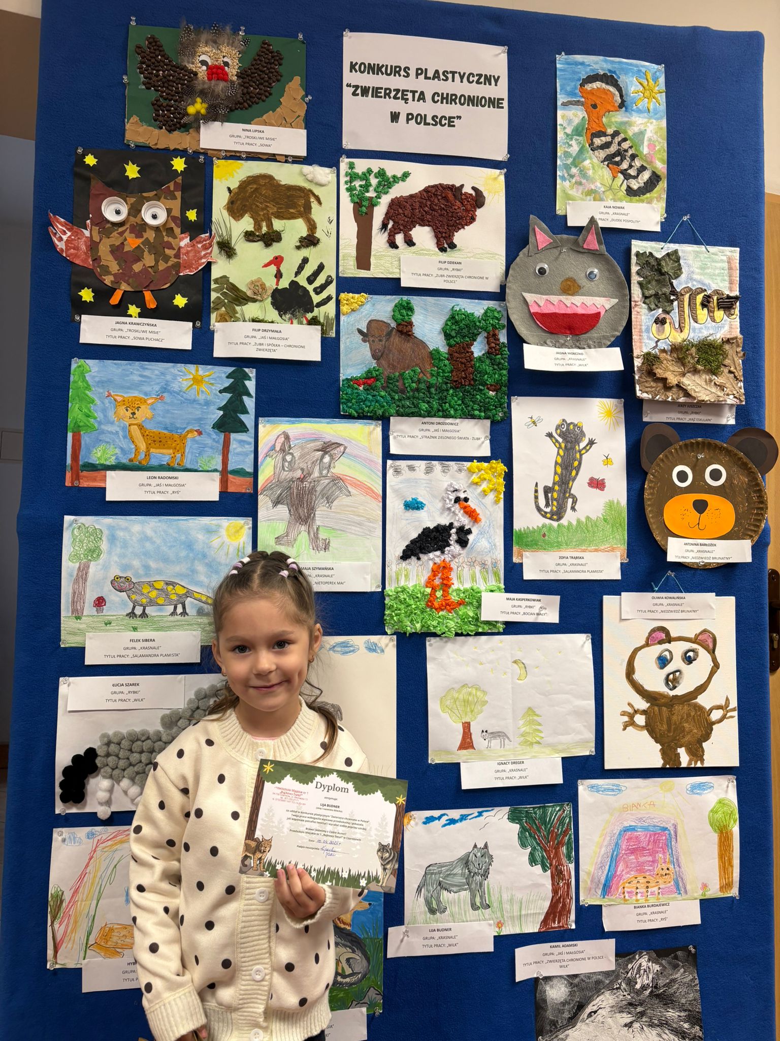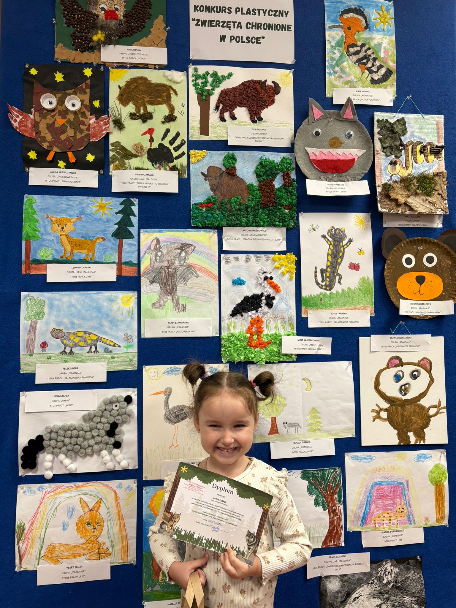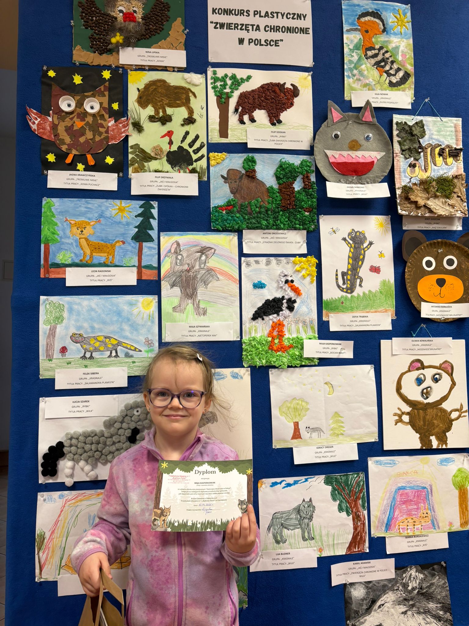 W konkursie plastycznym skierowanym do dzieci z grup 4 i 5‑letnich pt. „Zwierzęta chronione w Polsce” udział wzięło 23 dzieci. Celem głównym konkursu było przedstawienie wybranego gatunku zwierzęcia objętego ochroną w Polsce w formie pracy plastycznej.